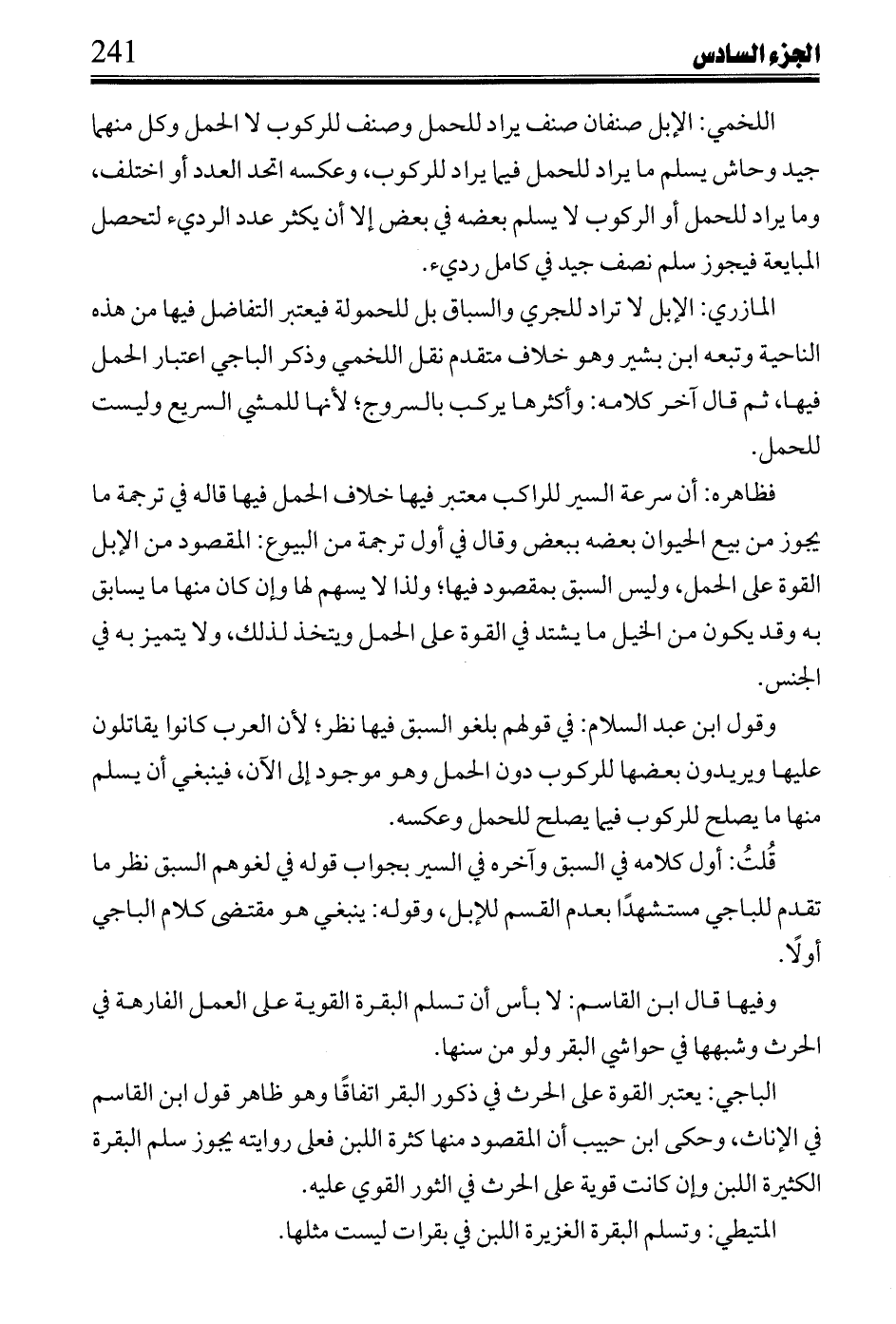 المازري: الإبل لا تراد للجري والسباق بل للحمولة فيعتبر التفاضل فيها من هذه الناحية وتبعه ابن بشير وهو خلاف متقدم نقل اللخمي وذكر الباجي اعتبار الحمل فيها، ثم قال آخر كلامه: وأكثرها يركب بالسروج؛ لأنها للمشي السريع وليست للحمل.