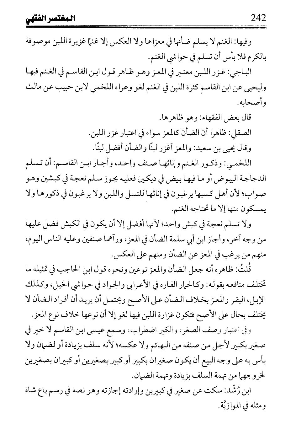 وفيها: الغنم لا يسلم ضأنها في معزاها ولا العكس إلا غنماً غزيرة اللبن موصوفة بالكرم فلا بأس أن تسلم في حواشي الغنم.