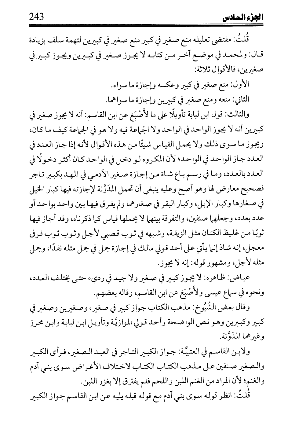ولابن القاسم في العتبيَّة: جواز الكبير التاجر في العبد الصغير، فرأى الكبير والصغير صنفين على مذهب الكتاب الكتاب لاختلاف الأغراض سوى بني آدم والغنم؛ لأن المراد من الغنم اللبن واللحم فلم يفترق إلا بغزر اللبن.