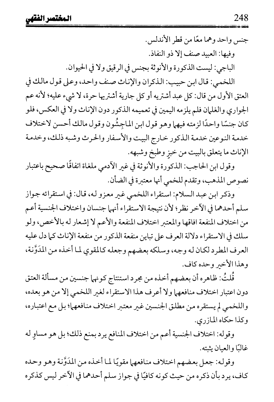 وذكر ابن عبد السلام: استقراء اللخمي غير معزو له، قال: في استقرائه جواز سلم أحدهما في لآخر نظر؛ لأن نتيجة الاستقراء أنهما جنسان واختلاف الجنسية أعم من اختلاف المنفعة افاقها والمعتبر اختلاف المنفعة والأعم لا إشعار له بالأخص، ولو سلك في الاستقراء دلالة العرف على تباين منفعة الذكور من منفعة الإناث كما دل عليه العرف المطرد لكان له وجه، وسلكه بعضهم وجعله كالمقوي لما أخذه من المدونة، وهذا الأخير وحده كاف.