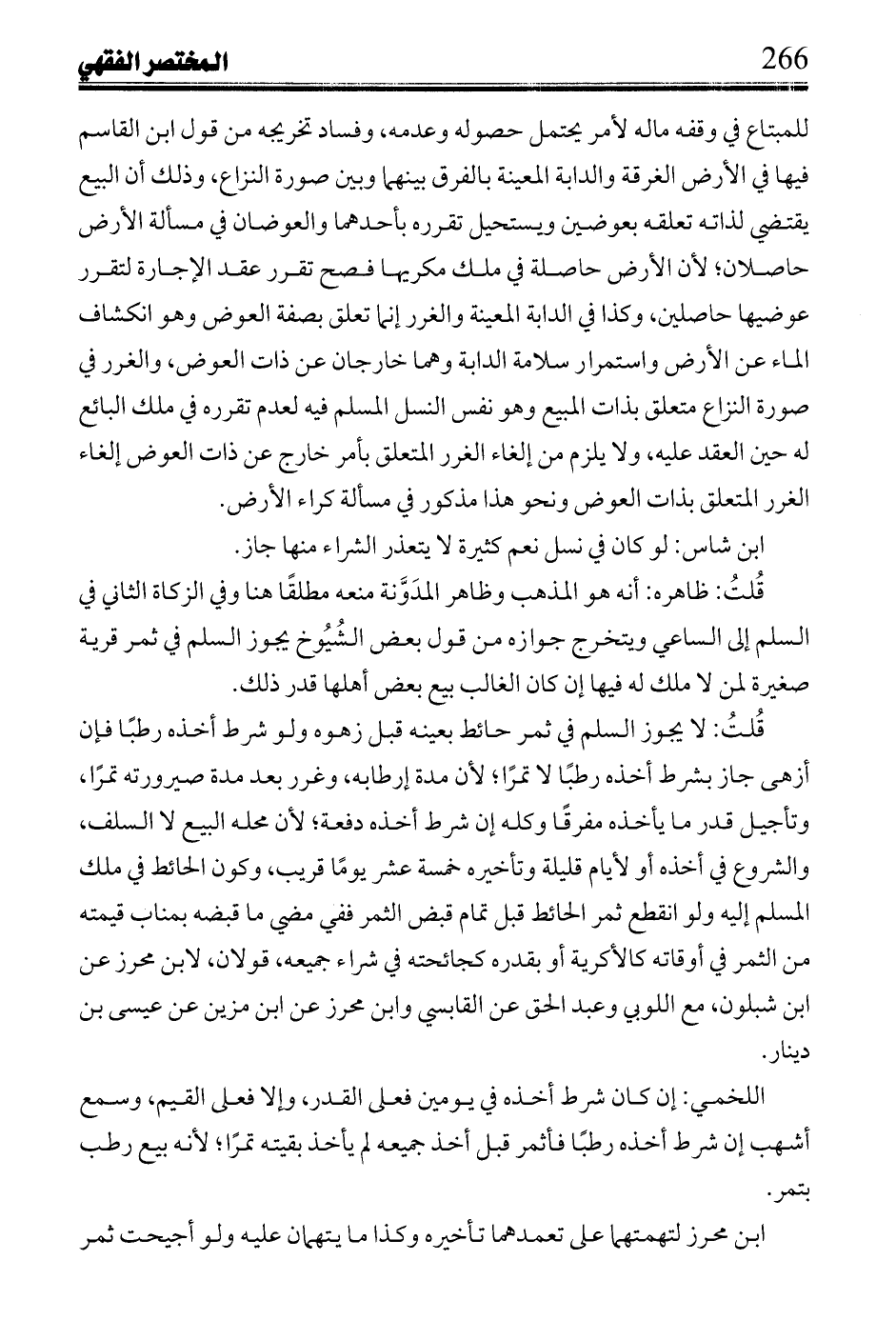 قُلتُ: لا يجوز السلم في ثمر حائط بعينه قبل زهوه ولو شرط أخذه رطبًا فإن أزهى جاز بشرط أخذه رطبًا لا تمرًا؛ لأن مدة إرباطه، وغرر بعد مدة صيرورته تمرًا، وتأجيل قدر ما يأخذه مفرقًا وكله إن شرط أخذه دفعة؛ لان محله البيع لا السلف، والشروع في أخذه أو لأيام قليلة وتأخيره خمسة عشر يومًا قريب، وكون الحائط في ملك المسلم إليه ولو انقطع ثمر الحائط قبل تمام قبض الثمر ففي مضي ما قبضه بمناب قيمته من الثمر في أوقاته كالأكرية أو بقدره كجائحته في شراء جميعه، قولان، لابن محرز عن ابن شبلون، مع اللوبي وعبد الحق عن القابسي وابن محرز عن ابن مزين عن عيسى بن دينار.