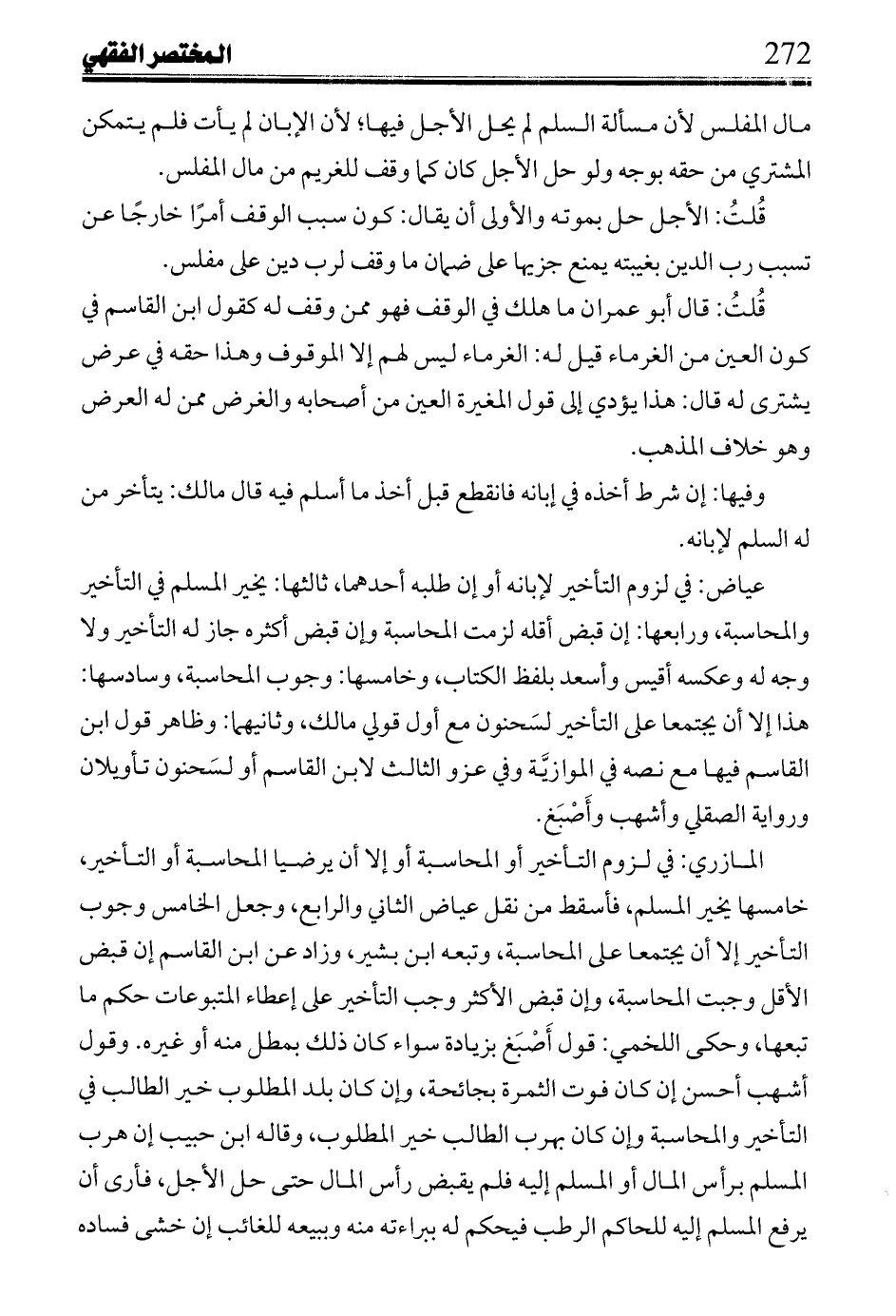 المازري: في لزوم التأخير أو المحاسبة أو إلا أن يرضيا المحاسبة أو التأخير، خامسها يخير المسلم، فأسقط من نقل عياض الثاني والرابع، وجعل الخامس وجوب التأخير إلا أن يجتمعا على المحاسبة، وتبعه ابن بشير، وزاد عن ابن القاسم إن قبض الأقل وجبت المحاسبة، وإن قبض الأكثر وجب التأخير على إعطاء المتبوعات حكم ما تبعها، وحكى اللخمي: قول أصبغ بزيادة سواء كان ذلك بمطل منه أو غيره. وقول أشهب أحسن إن كان فوت الثمرة بجائحة، وإن كان بلد المطلوب، وقاله ابن حبيب إن هرب المسلم برأس المال او المسلم إليه فلم يقبض رأس المال حتى حل الأجل، فأرى أن يرفع المسلم إليه للحاكم الرطب فيحكم له ببراءته منه وببيعه للغائب إن خشى فساده