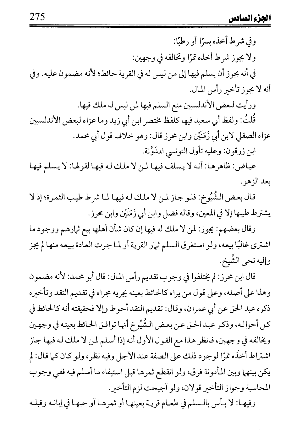 عياض: ظاهرها: انه لا سلف فيها لمن لا ملك له فيها لقولها: لا يسلم فيها بعد الزهو.