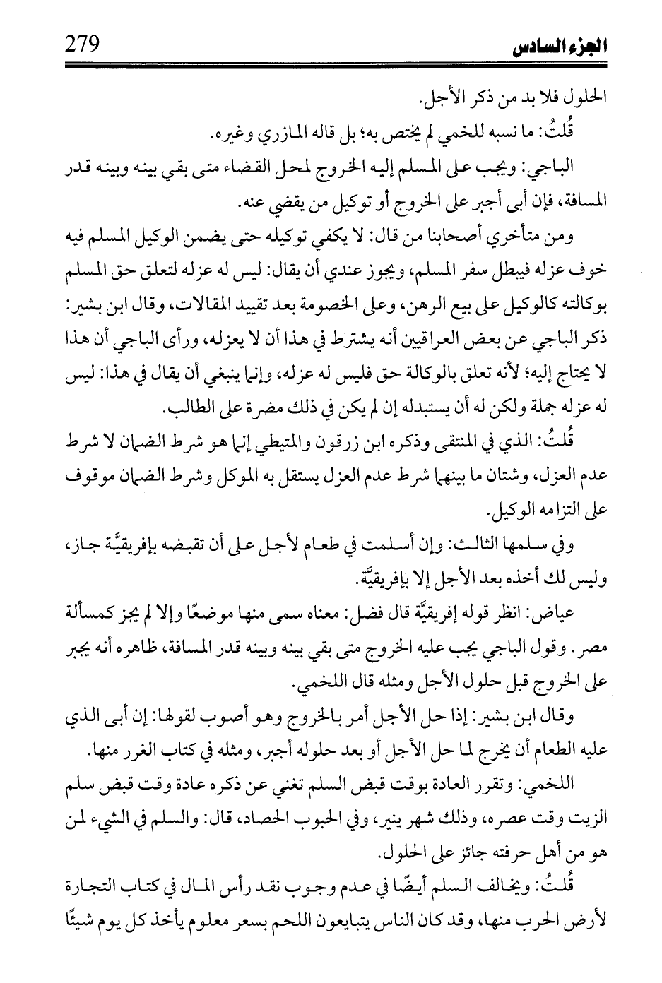 قلت: ويخالف السلم أيضا في عدم وجوب نقد رأس المال في كتاب التجارة لأرض الحرب منها، وقد كان الناس يتبايعون اللحم بسعر معلوم يأخذ كل يوم شيئاً