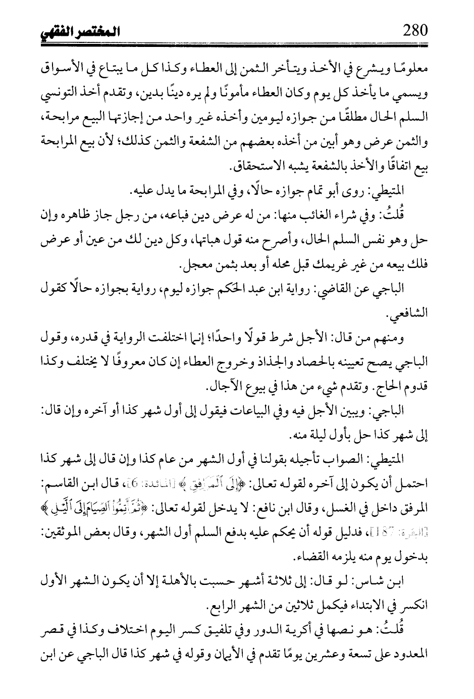 المتيطي: الصواب تأجيله بقولنا في أول الشهر من عام كذا وإن قال إلى شهر كذا احتمل ان يكون إلى آخره لقوله تعالى" (إِلَى الْمَرَافِقِ) [المائدة:6]، قال ابن القاسم: المرفق داخل في الغسل، وقال ابن نافع: لا يدخل لقوله تعالى: (ثُمَّ أَتِمُّوا الصِّيَامَ إِلَى اللَّيْلِ) [البقرة:187]، فدليل قوله أن يحكم عليه بدفع السلم أول الشهر، وقال بعض الموثقين: بدخول يوم منه يلزمه القضاء.