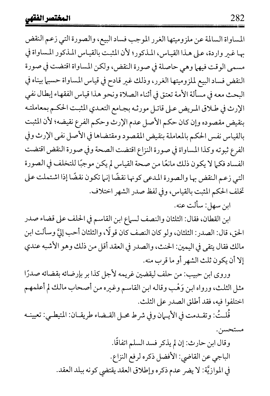 المساواة السالمة عن ملزوميتها الغرور الموجب فساد البيع، والصورة التي زعم النقض بها غير واردة، على هذا القياس، المذكور؛ لأن المثبت بالقياس المذكور المساواة في مسمى الوقت فيهما وهي حاصلة في صورة النقض، ولكن المساواة اقتضت في صورة النقض فساد البيع لملزوميتها الغرر، وذلك غير قادح في قياس المساواة حسبما بيناه في البحث معه في مسألة الأمة تعتق أثناء الصلاة ونحو هذا قياس الفقهاء إبطال نفي الإرث في طلاق المريض على قاتل مورثه بجامع التعدي المثبت الحكم بمعاملته بنقيض مقصوده وإن كان حكم الأصل عدم الإرث وحكم الفرع نقيضه؛ لأن المثبت بالقياس نفس الحكم بالمعاملة بنقيض المقصود ومقتضاها في الأصل نفي الإرث وفي الفرع ثبوته وكذا المساواة في صورة النزاع اقتضت الصحة وفي صورة النقض اقتضت الفساد فكما لا يكون ذلك مانعا من صحة القياس لم يكن موجبا للتخلف في الصورة التي زعم النقض بها والصورة المدعي كونها نقضا إنما تكون نقضا إذا اشتملت على تخلف الحكم المثبت بالقياس، وفي لفظ صدر الشهر اختلاف.