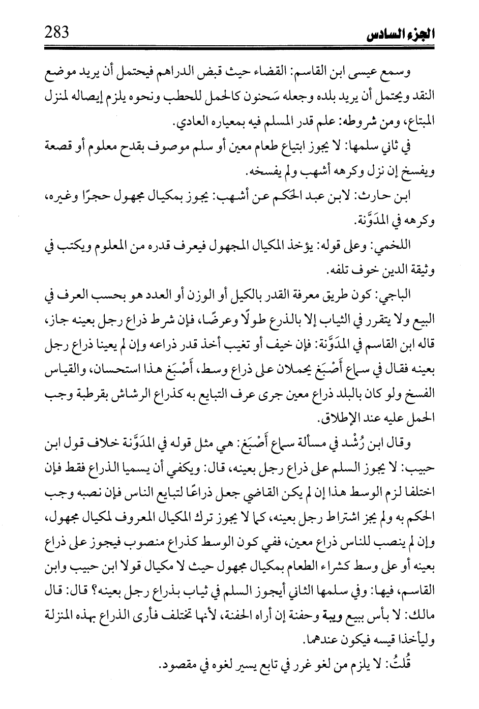 وقال ابن رشد في مسألة سماع أصبغ: هي مثل قوله في المدونة خلاف قول ابن حبيب: لا يجوز السلم على ذراع رجل بعينه، قال: ويكفي أن يسميا الذراع فقط فإن اختلفا لزم الوسط هذا إن لم يكن القاضي جعل ذراعا لتبايع الناس فغن نصبه وجب الحكم به ولو يجز اشتراط رجل بعينه، كما لا يجوز ترك المكيال المعروف لمكيال مجهول، وإن لم ينصب للناس ذراع معين، ففي كون الوسط كذراع منصوب فيجوز على ذراع بعينه أو على وسط كشراء الطعام بمكيال مجهول حيث لا مكيال قولا ابن حبيب وابن القاسم، فيها: وفي سلمها الثامي أيجوز السلم في ثياب بذراع رجل بعينه؟ قال: قال مالك: لا بأس ببيع ويبه وحفنة إن أراه الحفنة، لأنها تختلف فأرى الذراع بهذه المنزلة وليأخذا قيسه فيكون عندهما.