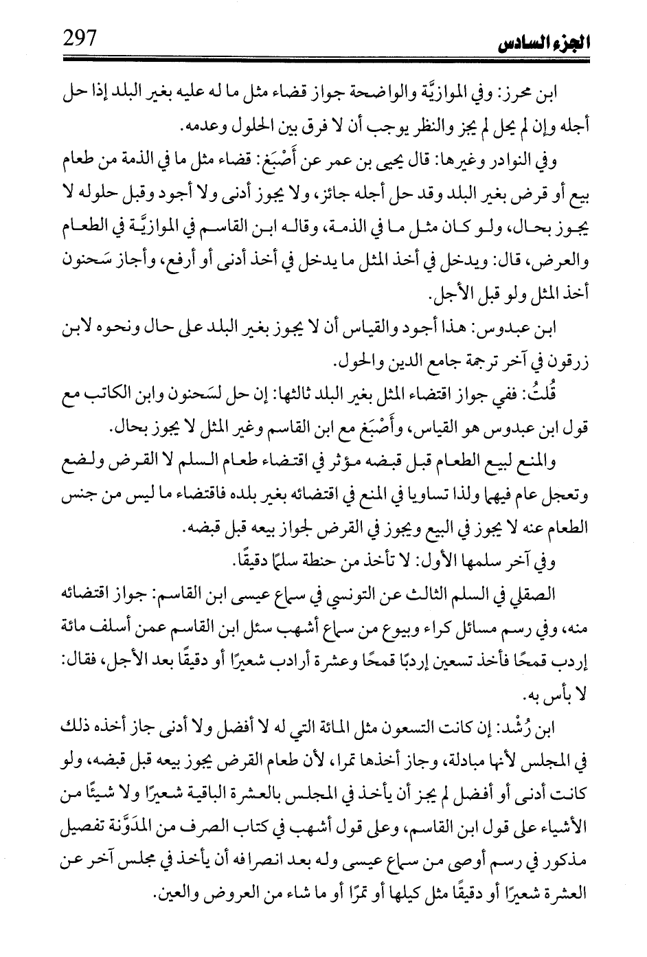 وفي النوادر وغيرها: قال يحيى بن عمر عن أَصْبَغ: قضاء مثل ما في الذمة من طعام بيع أو قرض بغير البلد وقد حل أجله جائز، ولا يجوز أدنى ولا أجود وقبل حلوله لا يجوز بحال، ولو كان مثل ما في الذمة، وقاله ابن القاسم في الموازيَّة في الطعام والعرض، قال: ويدخل في أخذ المثل ما يدخل في أخذ أدنى أو أرفع، وأجاز سَحنون أخذ المثل ولو قبل الأجل.