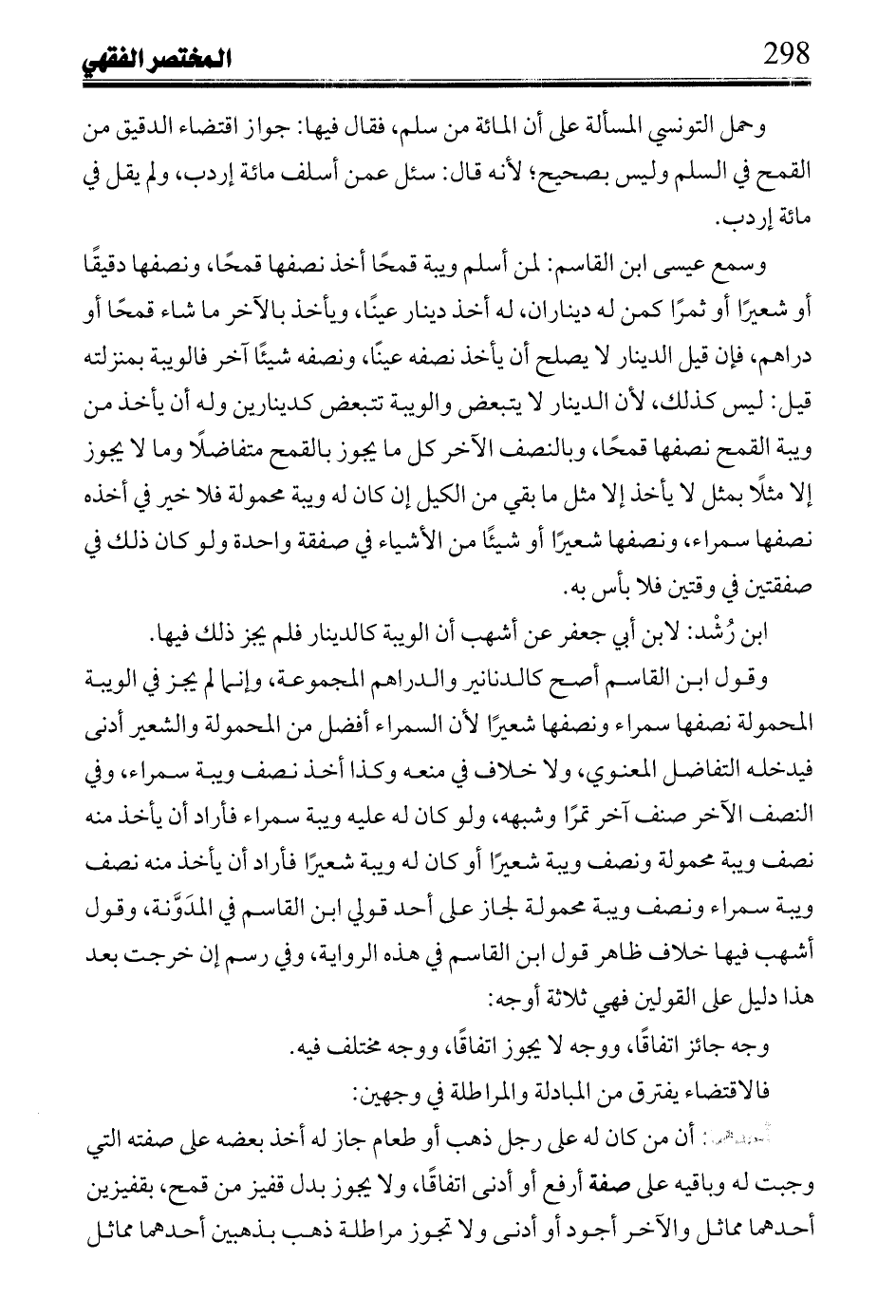 وقول ابن القاسم أصح كالدنانير والدراهم المجموعة، وإنما لم يجز في الويبة المحمولة نصفها سمراء ونصفها شعيرًا لأن السمراء أفضل من المحمولة والشعير أدنى فيدخله التفاضل المعنوي، ولا خلاف في منعه وكذا أخذ نصف ويبة سمراء، وفي النصف الآخر صنف آخر تمرًا وشبهه، ولو كان له عليه ويبة سمراء فأراد أن يخذ منه نصف ويبة محمولة ونصف ويبة شعيرًا أو كان له ويبة شعيرًا فأراد أن يأخذ منه نصف ويبة سمراء ونصف ويبة محمولة لجاز على أحد قولي ابن القاسم في المدَوَّنة، وقول أشهب فيها خلاف ظاهر قول ابن القاسم في هذه الرواية، وفي رسم إن خرجت بعد هذا دليل على القولين فهي ثلاثة أوجه: