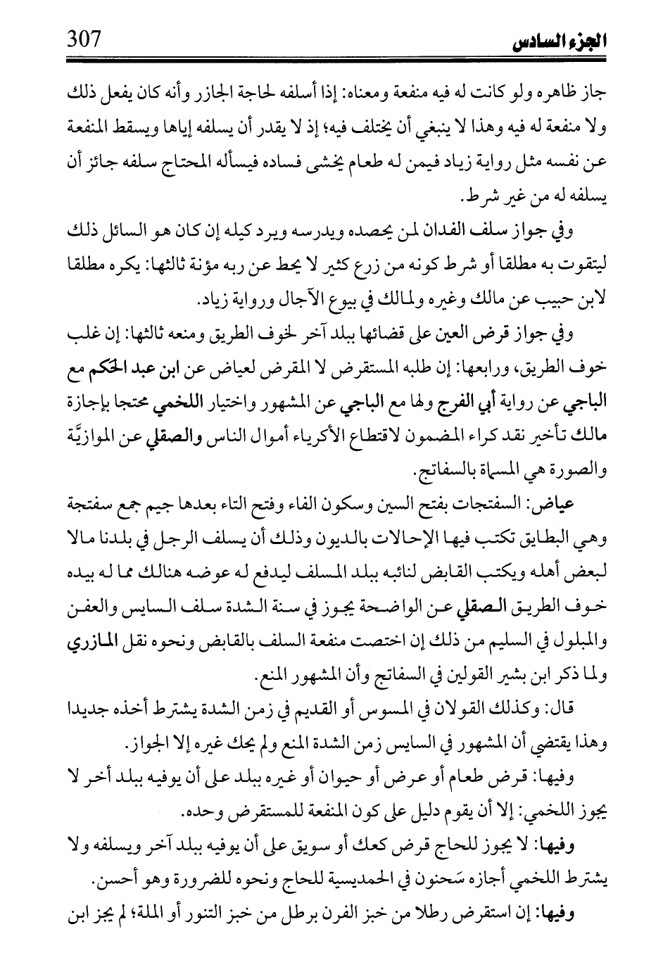 وفي جواز قرض العين على قضائها ببلد آخر لخوف الطريق ومنعه ثالثها: إن غلب خوف الطريق، ورابعها: إن طلبه المستقرض لا المقرض لعياض عن ابن الحَكم مع الباجي عن رواية أبي الفرج ولها مع الباجي عن المشهور واختيار اللخمي محتجا بإجازة مالك تأخير نقد كراء المضمون لاقتطاع الأكرياء أموال الناس والصقلي عن الموازيَّة والصورة هي المسماة بالسفاتج.