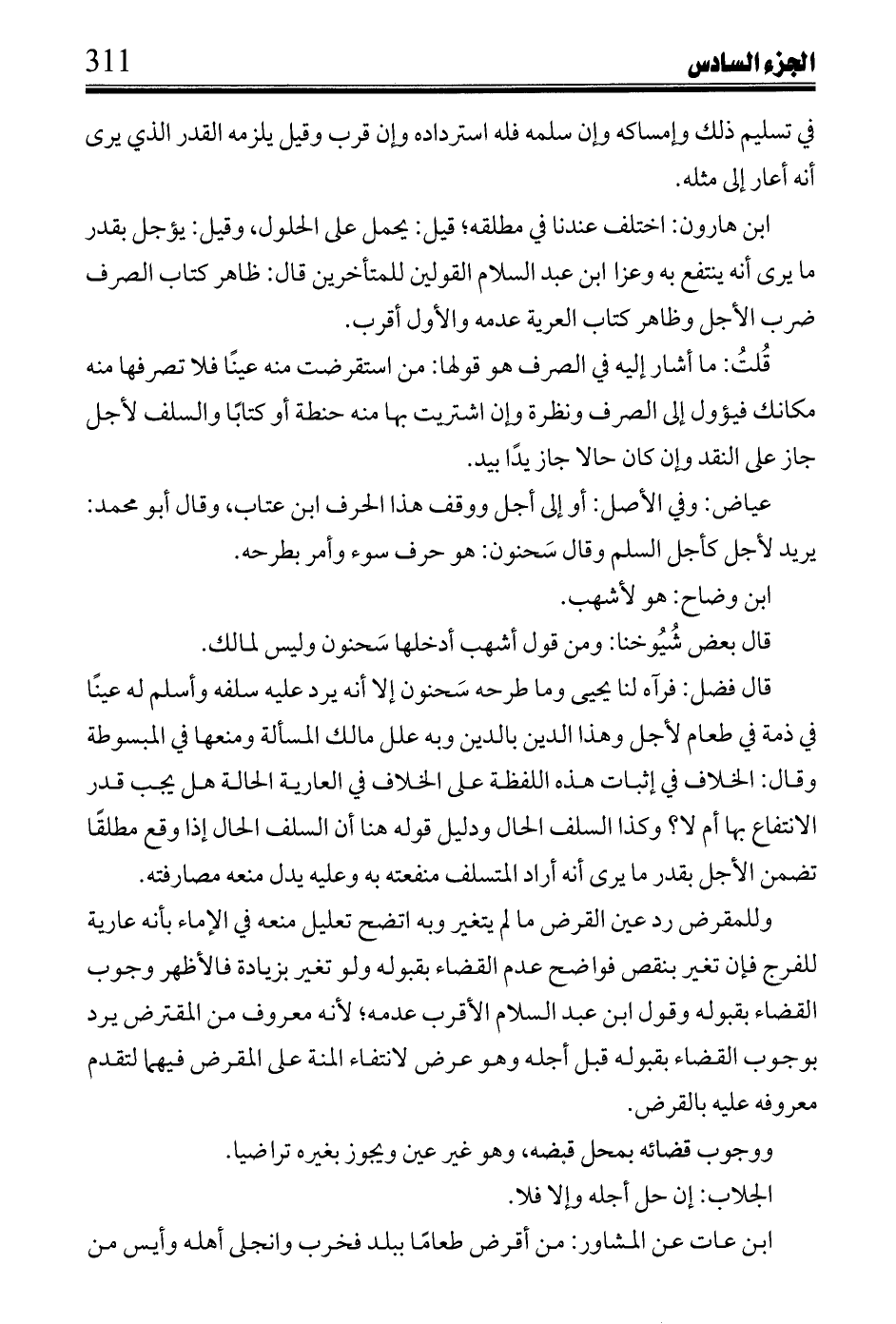 عياض: وفي الأصل: أو إلى أجل ووقف هذا الحرف ابن عتاب، وقال أبو محمد: يريد لأجل كأجل السلم وقال سحنون: هو حرف سوء وأمر بطرحه.