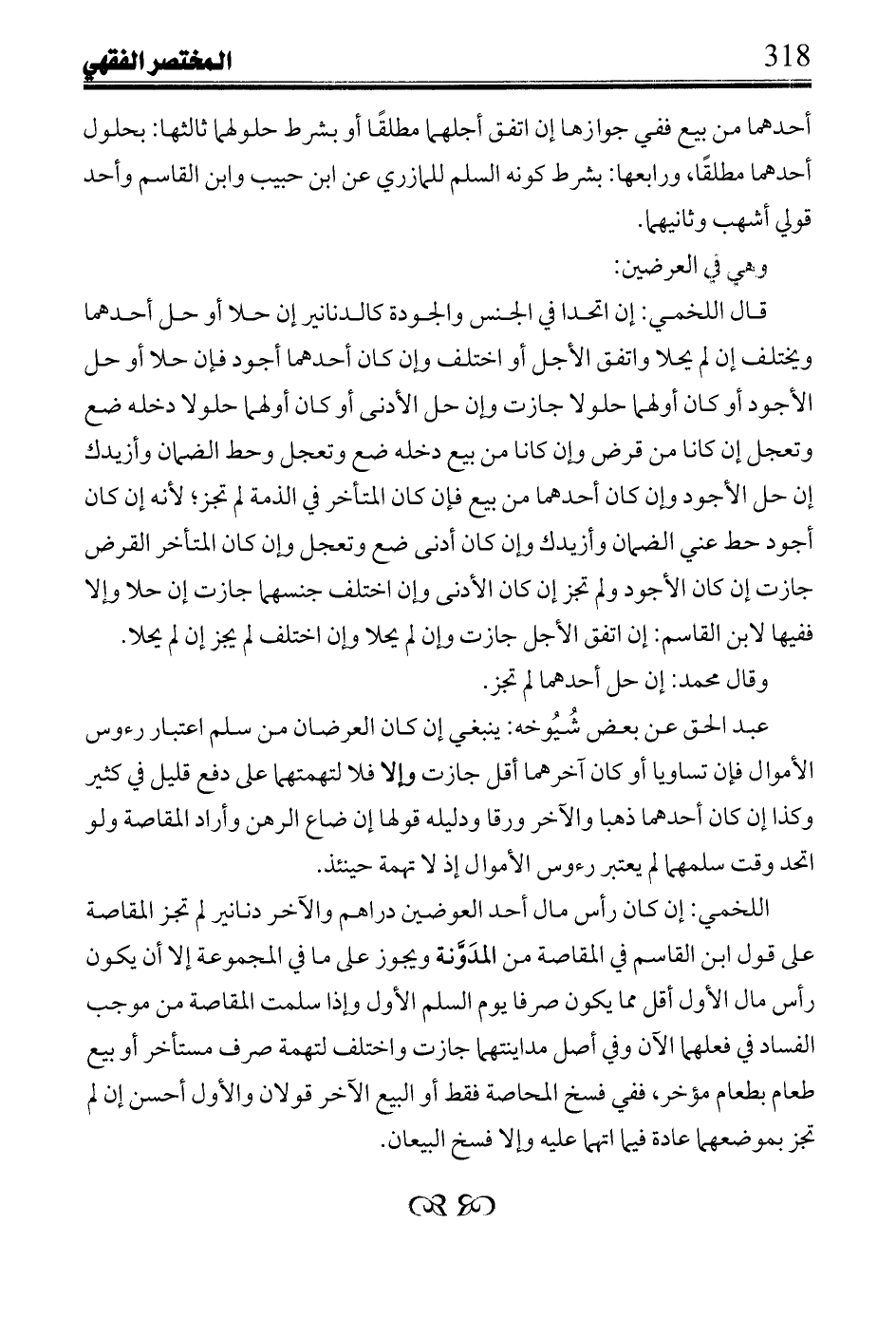 عبد الحق عن بعض شيوخه: ينبغي إن كان العرضان من سلم اعتبار رءوس الأموال فغن تساويا أو كان آخرهما أقل جازت وإلا فلا لتهمتهما على دفع قليل في كثير وكذا إن كان أحدهما ذهبا والآخر ورقا ودليله قولها إن ضاع الرهن وأراد المقاصة ولو اتحد وقت سلمهما لم يعتبر رءوس الأموال إذ لا تهمة حينئذ.