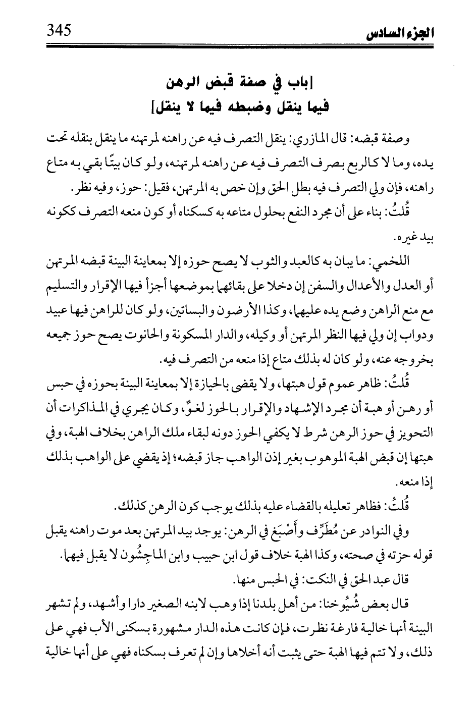 اللخمي: حوز الحظ المرتهن بكونه على يد مرتهنه أو الشريك أو غيرهما، وفي كون ما ينقل كالثوب والعبد كذلك أو يكون جميعه تحد يد أحد الثلاثة قولا ابن القاسم وأشهب، وعزاه محمد في النوادر له، ولعبد الملك في حوز المشاع مما باقيه لراهنه طرق.