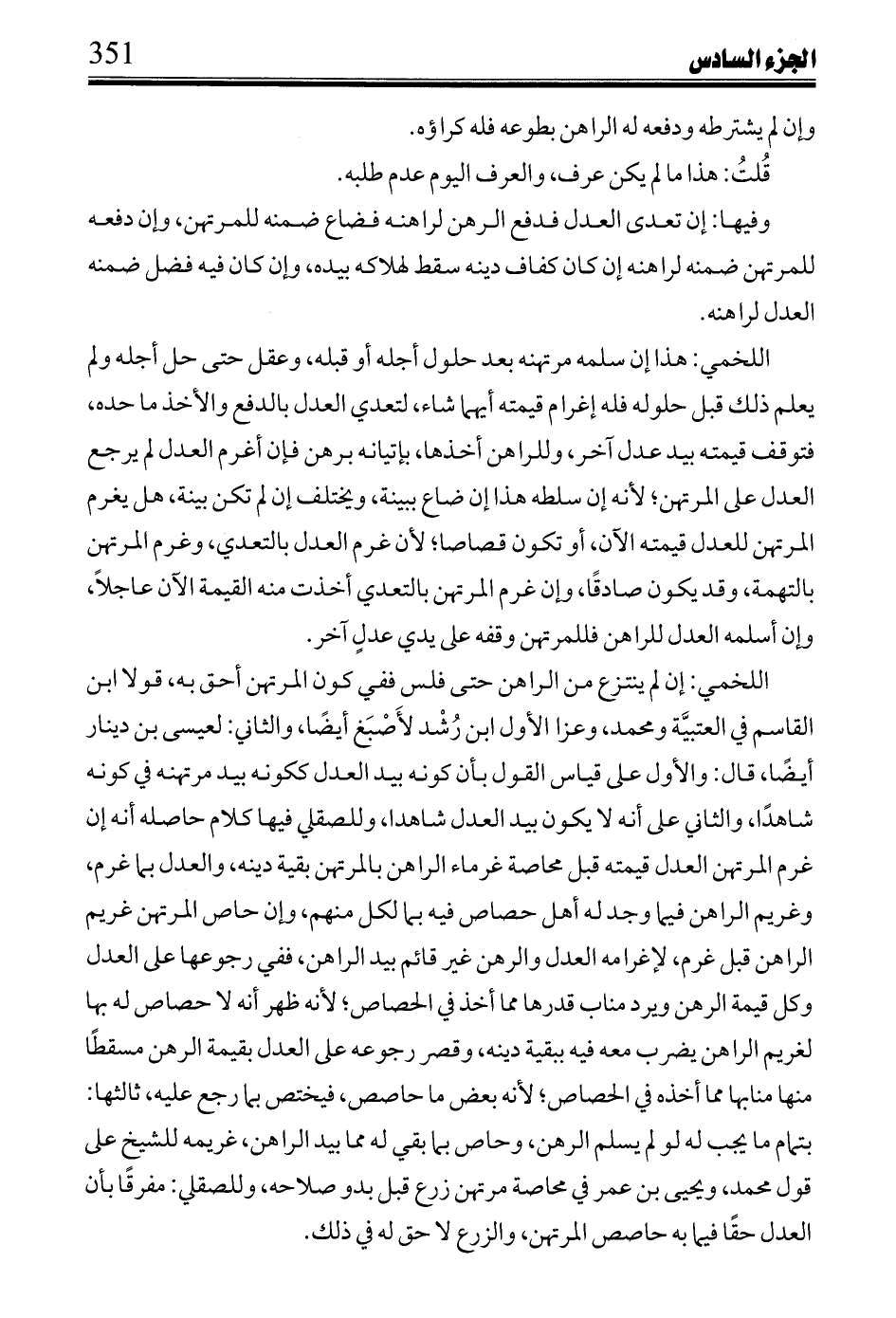 قلت: وقبول ابن رشد ما في السماع مع بعد عدم ذكره مسألة المدّوَّنة يقتضي عدم ورود تعقب فلعله؛ لأن شريكه كمن هو من ناحيته لعلاقة الشركة، أو لأن الشركة أو لأن المرتهن مختار في رجوع الرهن لراهنه في مسألة الشريك لقدرته على القيام بالمقاسمة ليختص فيحوز رهنه، وهو دليل قول ابن القاسم في تعليلها بقوله؛ لأن إذا لم يقم بقبض نصفه ويقاسم الشريك صار غير حائز لرهنه، ولو قال الشريك: أنا أكري حظي من الراهن لم يمنع، وقسمت الدار ليحوز المرتهن رهنه، ويكري الشريك من الراهن رهنه والمرتهن غير قادر على اختصاصه بالرهن في اكترائه من الأجنبي من الراهن.