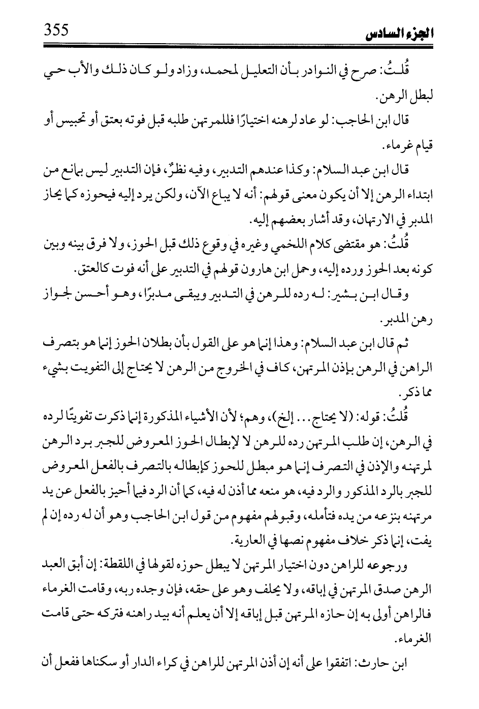 قلتُ: فنقل المازري مسألة الخلاف بلفظ لو اتفاقًا على عاريته لرجل قاصدُا لإيهامه أنهما استويا في عاريته فيلزم الخلاف في استقلال المرتهن بها بإذن الراهن، ولابن رشد في أول مسألة من رسم الرهون من سماع عيسى، قوله: اضطربت ألفاظ السماع فيمن يلي المؤاجرة في الرهن وكرائه، فقوله أول كلامه: ليس لمرتهن ما له غلة أن يحول بين الراهن وبين استعمال رهنه؛ يريد: لا يحول بينه وبين عقد الإجارة يتولى ذلك والكراء فيه، وقال: ليس للراهن أن يفعل ذلك إلا بإذنه وعلمه فدل قوله على أن الراهن هو الذي يلي ذلك بأمر المرتهن، وقال آخر المسألة: المرتهن هو الذي يعامل في عمل الحائط فيبيع الغلة ويؤاجر الدار، وليس للراهن في ذلك أمر فدل قوله على أن المرتهن هو الذي يلي ذلك، والذي أقول في ذلك إن كانت الغلة لم يشترطها المرتهن ولي المرتهن الكراء، ولم يجز أن يليه الراهن؛ لأنه إن وليه بإذن المرتهن وأخذ الغلة صار منتفعًا بالرهن فبطلت حيازة المرتهن وهو نص قوله فيها: إن أذن له أن يكري الدار، فقد خرجت من الرهن معناه عندي أنه أذن له أن يكريها ويأخذ كراءها، وعليه يحمل قوله أخر المسألة، والمرتهن والمسلم هو الذي يعامل في ذلك، وليس للراهن فيه أمر، وإن كانت الغلة رهنًا باشتراط المرتهن جاز أن يلي الراهن عقد الكراء فيها، والإجازة لها بإذن المرتهن، وعليه يحمل قوله أول كلامه، وفي ولاية المرتهن عقد الكراء دون إذن الراهن اختلاف.