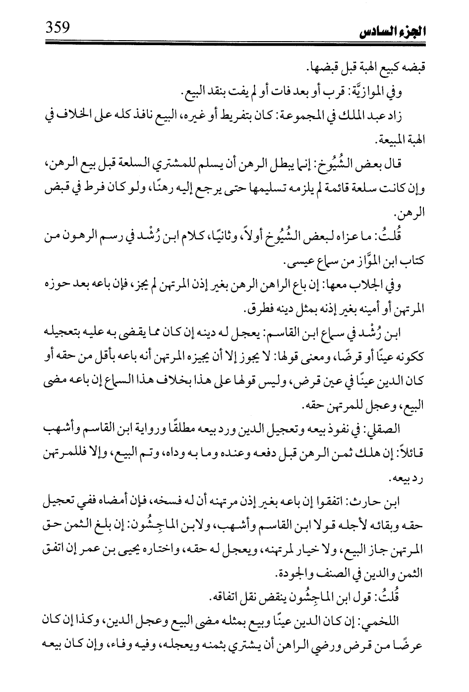 وفيها: بتعجل هذه, ولا يلزم قبول رهن ابن عبد السلام على هذا، ينفذ العتق، ويأتي برهن ثقة أعتقه قبل قبضه أو بعده، وهو في غاية البعد عن الروايات.