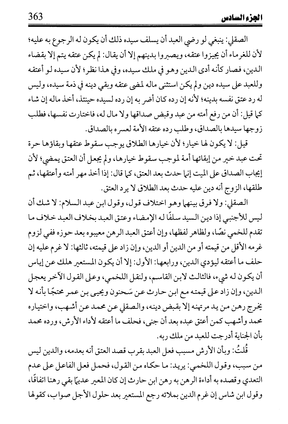وقال ابن عبد السلام: ليس ذلك انتزاعا، إنما هو شبه انتزاع، ولو كان انتزاعاً لافتقر بعد الفداء إلي تمليك آخر، ويرد بأن شبه الشيء في الفقهيات، كالشيء فما لزم في الانتزاع؛ لزم في شبهه؛ والصواب ما وقع في الموازيَّة أنه انتزاع، ويرد إلزام اللخمي علي أنه انتزاع افتقاره لرد جديد، فإنه انتزاع لشيء خاص، وهو دين الارتهان لا لمطلق ملك المنتزع، فإذا سقط تعلق دين الارتهان بقي على ما كان عليه لمن انتزع كمن انتزع جارية عبده بهبتها لرجل، فلم يقبلها.