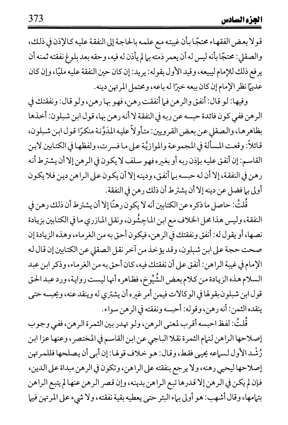 قُلتُ: فظاهر السماع عدم الافتقار إلي نص الراهن على أن الزرع فيما تسلفه لإحيائه رهن خلاف قول عبد الحق والصقلي، وظاهر كلامهم عدم الافتقار إلي إذن المرتهن خلاف قول ابن رُشْد، فاعلم ذلك، ونحو ذلك سماع ابن أبي زيد ابن القاسم رهن عبد شرط راهنه أنه مبدى في ثمنه على ما رهنه فيه بمائة، بمائة باطل.