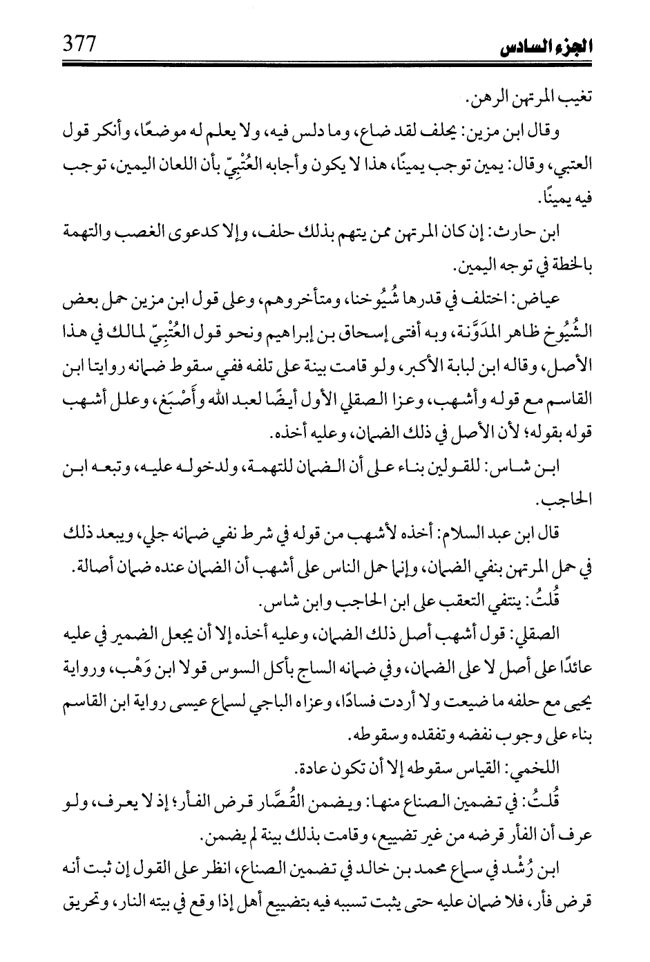 ابن عبد السلام وغيره: بأن ضمانه نصف إنما هو بالتهمة، فإن صح تأثيره ضمنه أجمع لاستحالة خيانته في نصفه مشاعا دون باقيها، وإن بطل تأثيرها لم يضمن منه شيئاً، وبه يبطل قياسه؛ لأن نصف الدينار إنما ضمنه باقتضائه، وإنما يتم القياس على أصل أشهب أن الضمان أصالة، ويجاب بأن تهمته؛ إنما هي مؤثرة فيما قبضه رهناً، وهذا الوصف إنما هو في نصفه فقط، كما لو دفع له ثوبين أحدهما رهن، والآخر وديعة، فادعى تلفهما.