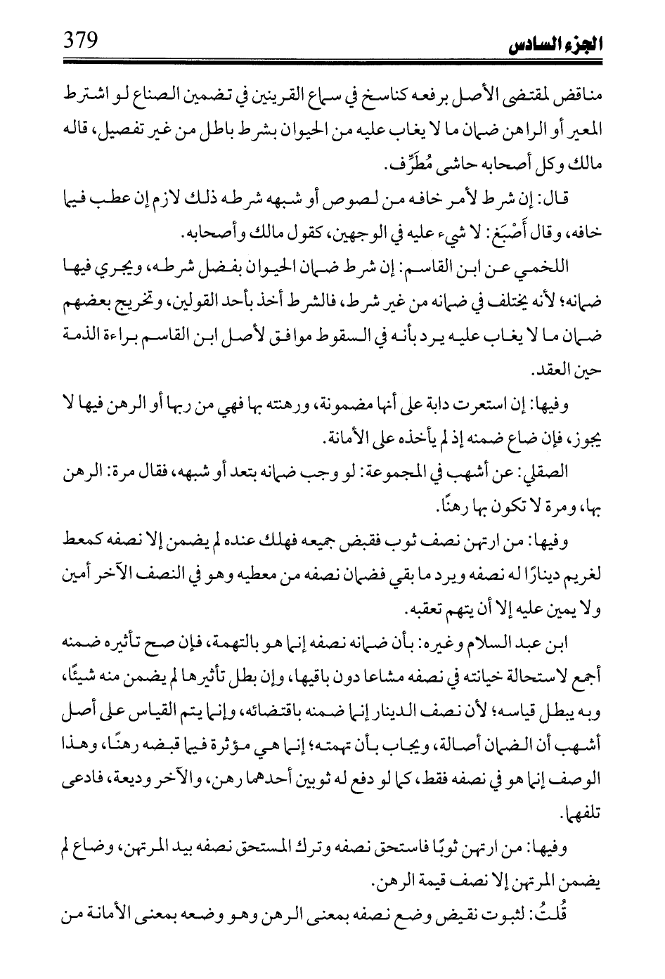قلت: والأولى بناء على إعطاء حكم نفسه، وعليهما نقل المازري وغيره في تمكينه بفدائه بيعه قبل أجله وعدمه قولا سحنون، والأكثر، والثانية بناءً على ما به الأولى مع جهل إيجاب الرهينة المطلقة عدم ماله غير رهن كاستحقاق مال عبد اشترى بماله لا يقال