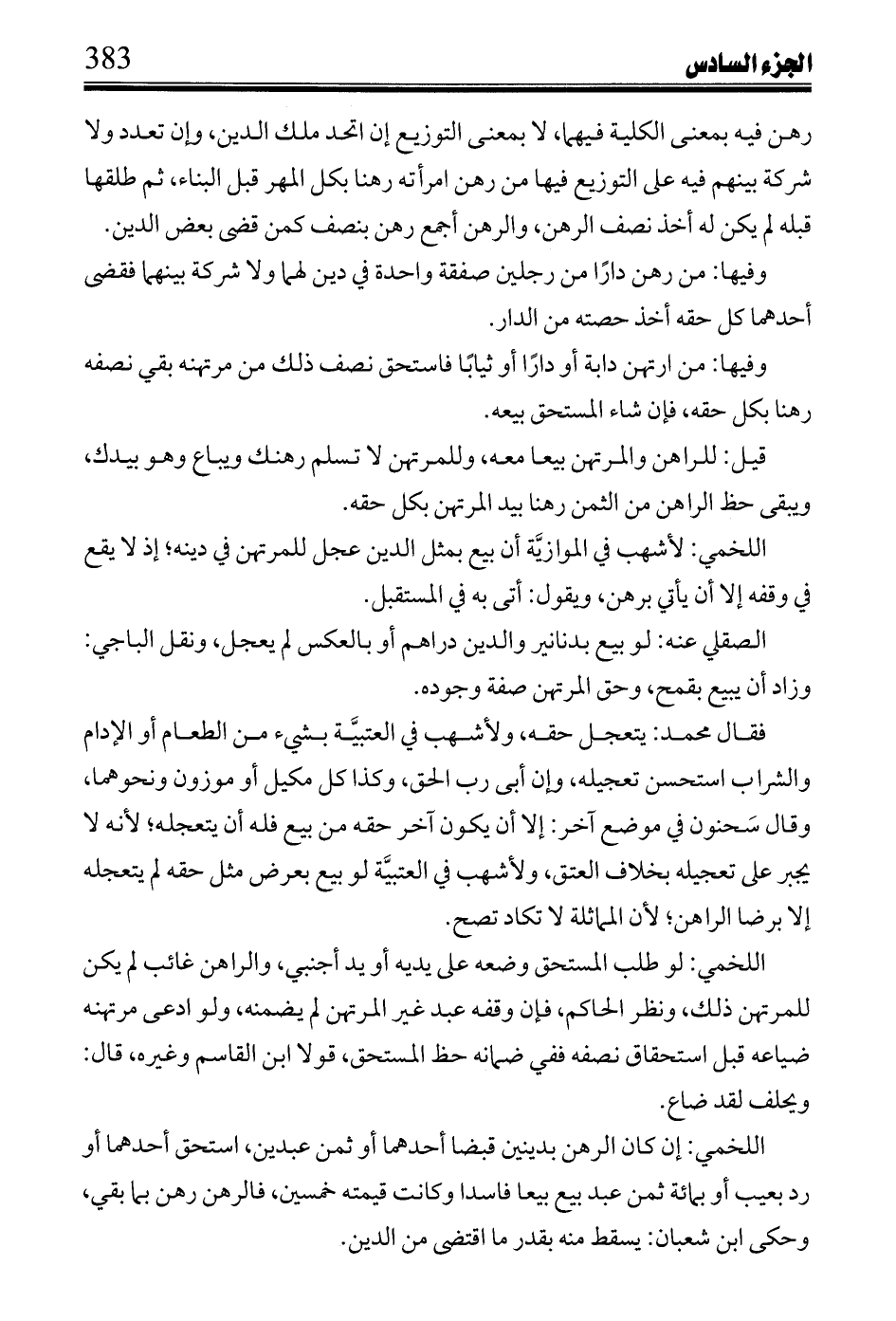اللخمي: لأشهب في الموازية أن بيع بمثل الدين عجل للمرتهن في دينه؛ إذ لا يقع في وقفه إلا أن يأتي برهن، ويقول: أتى به في المستقبل.