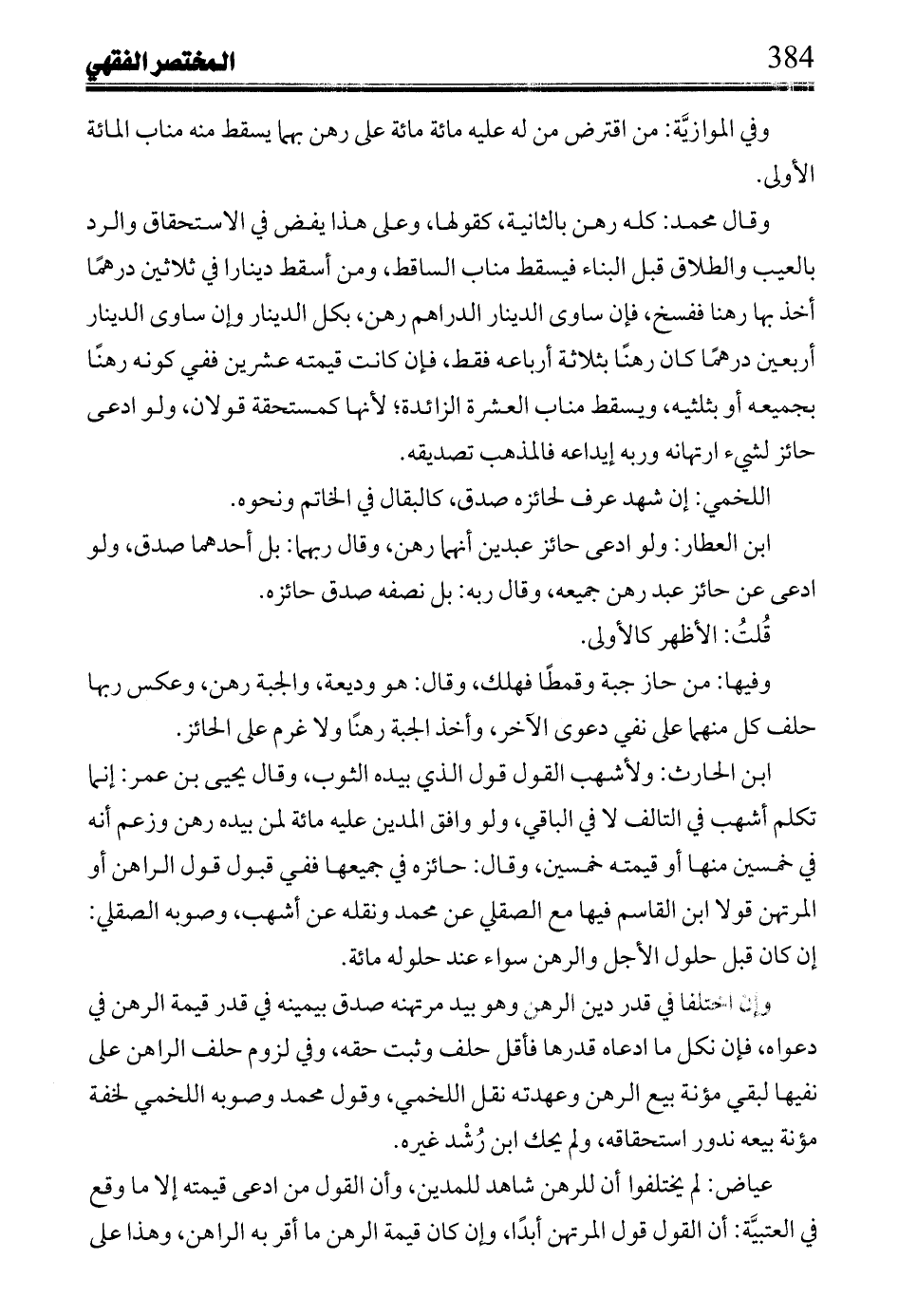 ابن الحارث: ولأشهب القول قول الذي بيده الثوب، وقال يحيى بن عمر: إنما تكلم أشهب في التالف لا في الباقي، ولو وافق المدين عليه مائة لمن بيده رهن وزعم أنه في خمسين منها أو قيمته خمسين، وقال: حائزه في جميعها ففي قبول قول الراهن أو المرتهن قولا ابن القاسم فيها مع الصقلي عن محمد ونقله عن أشهب، وصوبه الصقلي: إن كان قبل حلول الأجل والرهن سواء عند حلوله مائة.