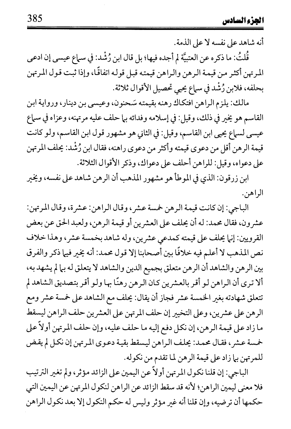 مالك: يلزم الراهن افتكاك رهنه بقيمته سحنون، وعيسى بن دينار، ورواية ابن القاسم هو يخير في ذلك، وقيل: في إسلامه وفدائه بما حلف عليه مرتهنه، وعزاه في سماع عيسى لسماع يحيى ابن القاسم، وقيل: في الثاني هو مشهور قول ابن القاسم، ولو كانت قيمة الرهن أقل من دعوى قيمته وأكثر من دعوى راهنه، فقال ابن رشد: يحلف المرتهن على دعواه، وقيل: للراهن أحلف على دعواك، وذكر الأقوال الثلاثة.