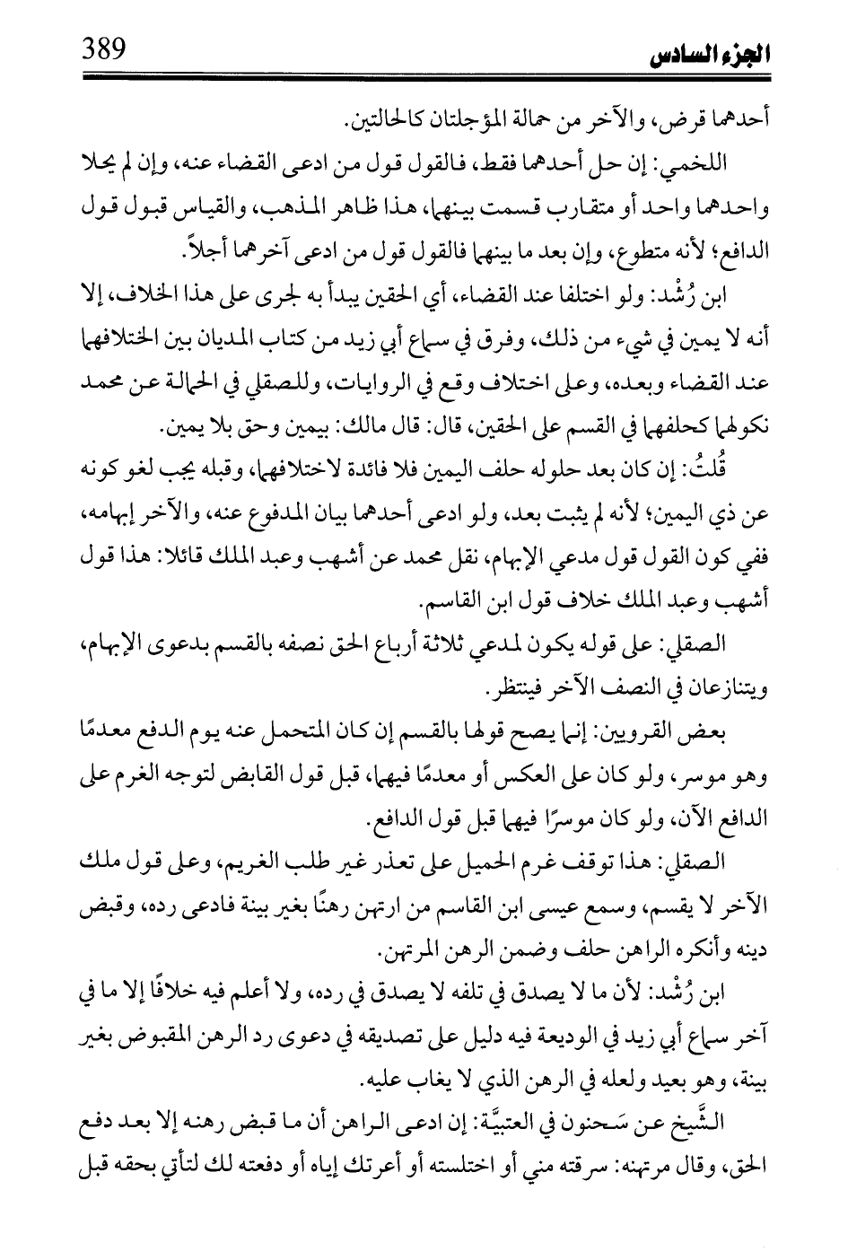 ابن رشد: ولو اختلفا عند القضاء، أي الحقين يبدأ به لجرى على هذا الخلاف، إلا أنه لا يمين في شيء من ذلك، وفرق في سماع أبي زيد من كتاب المديان بين اختلافهما عند القضاء وبعده، وعلى اختلاف وقع في الروايات، وللصقلي في الحملي عن محمد نكولهما كحلفهما في القسم على الحقين، قال: قال مالك: بيمين وحق بلا يمين.