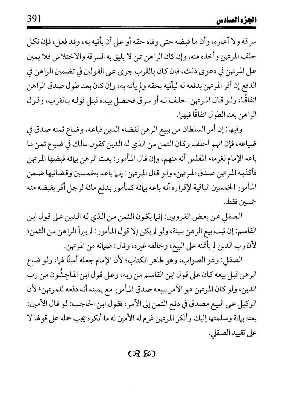 وفيها: إن أمر السلطان من يبيع الرهن لقضاء الدين فباعه، وضاع ثمنه صدق في ضياعه، فإن اتهم أحلف وكان الثمن من الذي له الدين كقول مالك في ضياع ثمن ما باعه الإمام لغرماء المفلس أنه منهم، وإن قال المأمور: بعت الرهن بمائة قبضها المرتهن فأكذبه المرتهن صدق المرتهن، ولو قال المرتهن: إنما باعه بخمسين وقضانيها ضمن المأمور الخمسين الباقية لإقراره أنه باعه بمائة كمأمور بدفع مائة لرجل أقر بقبضه منه خمسين فقط.