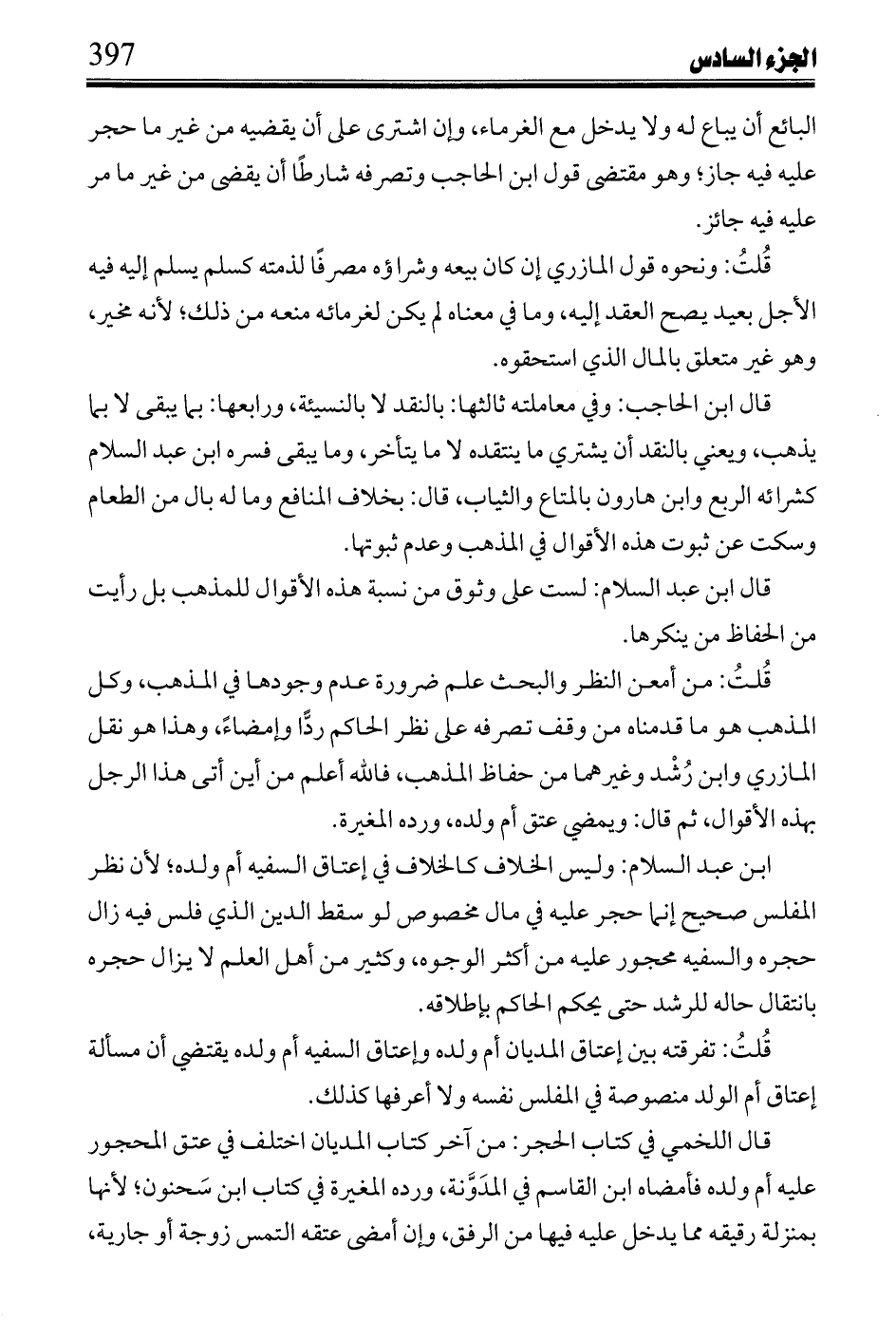 ابن عبد السلام: وليس الخلاف كالخلاف في إعتاق السفيه أم ولده؛ لأن نظر المفلس صحيح إنما حجر عليه في مال مخصوص لو سقط الدين الذي فلس فيه زال حجره والسفيه محجور عليه من أكثر الوجوه، وكثير من أهل العلم لا يزال حجره بانتقال حاله للرشد حتى يحكم الحاكم بإطلاقه.