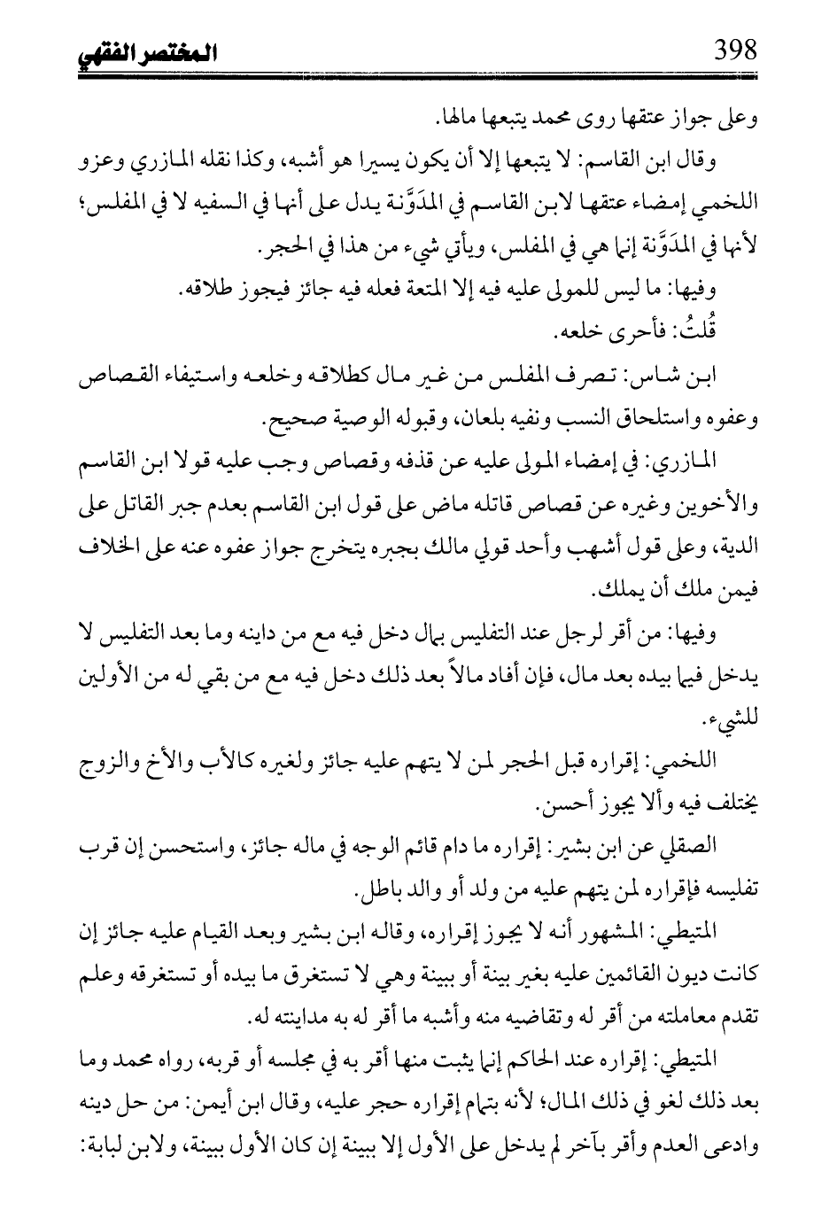 ابن شاس: تصرف المفلس من غير مال كطلاقه وخلعه واستيفاء القصاص وعفوه واستلحاق النسب ونفيه بلعان، وقبوله الوصية صحيح.
