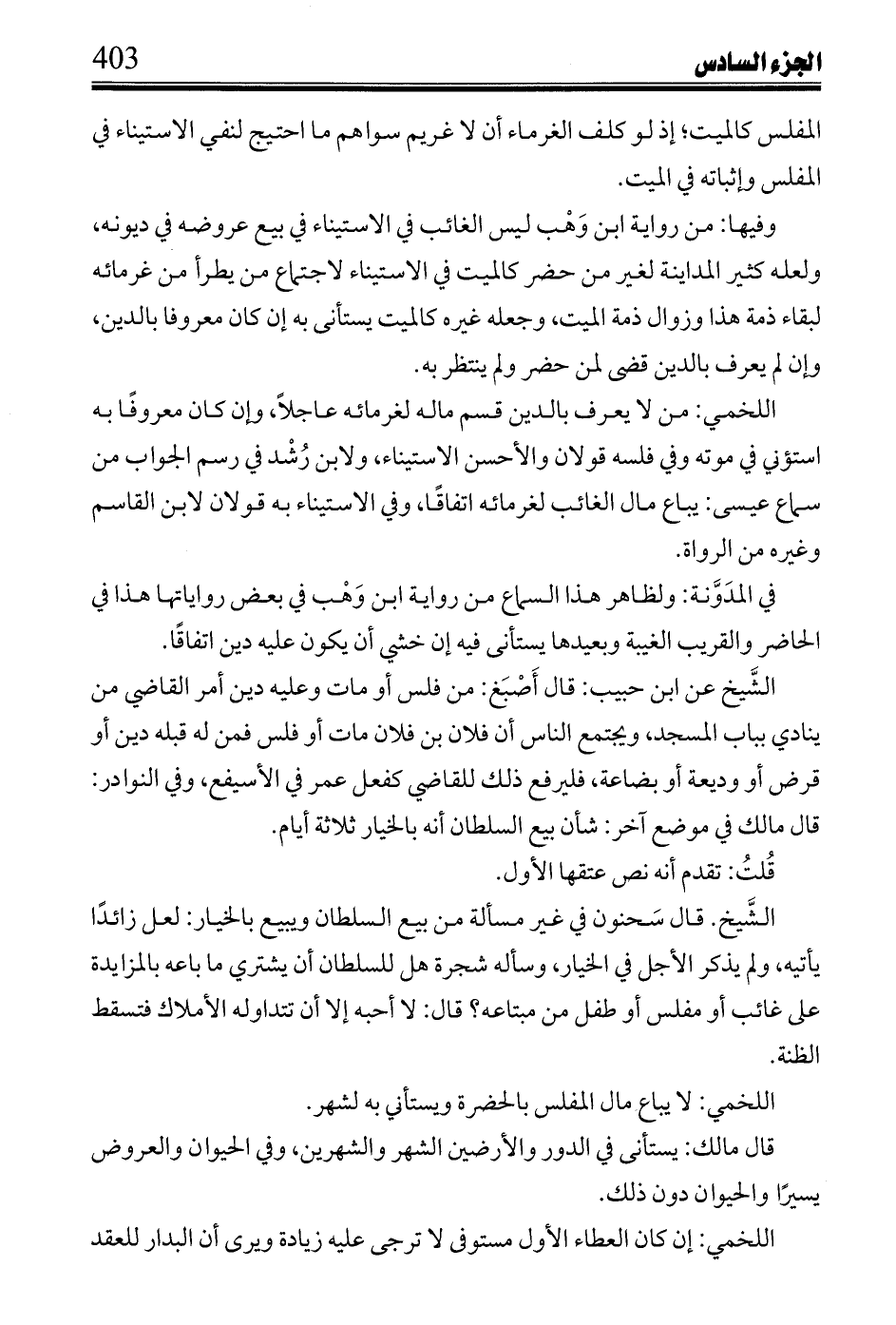 وفيها: من رواية ابن وهب ليس الغائب في الاستيناء في بيع عروضه في ديونه، ولعله كثير المداينة لغير من حضر كالميت في الاستيناء لاجتماع من يطرأ من غرمائه لبقاء ذمة هذا وزوال ذمة الميت، وجعله غيره كالميت يستأنى به إن كان معروفا بالدين، وإن لم يعرف بالدين قضى لمن حضر ولم ينتظر به.
