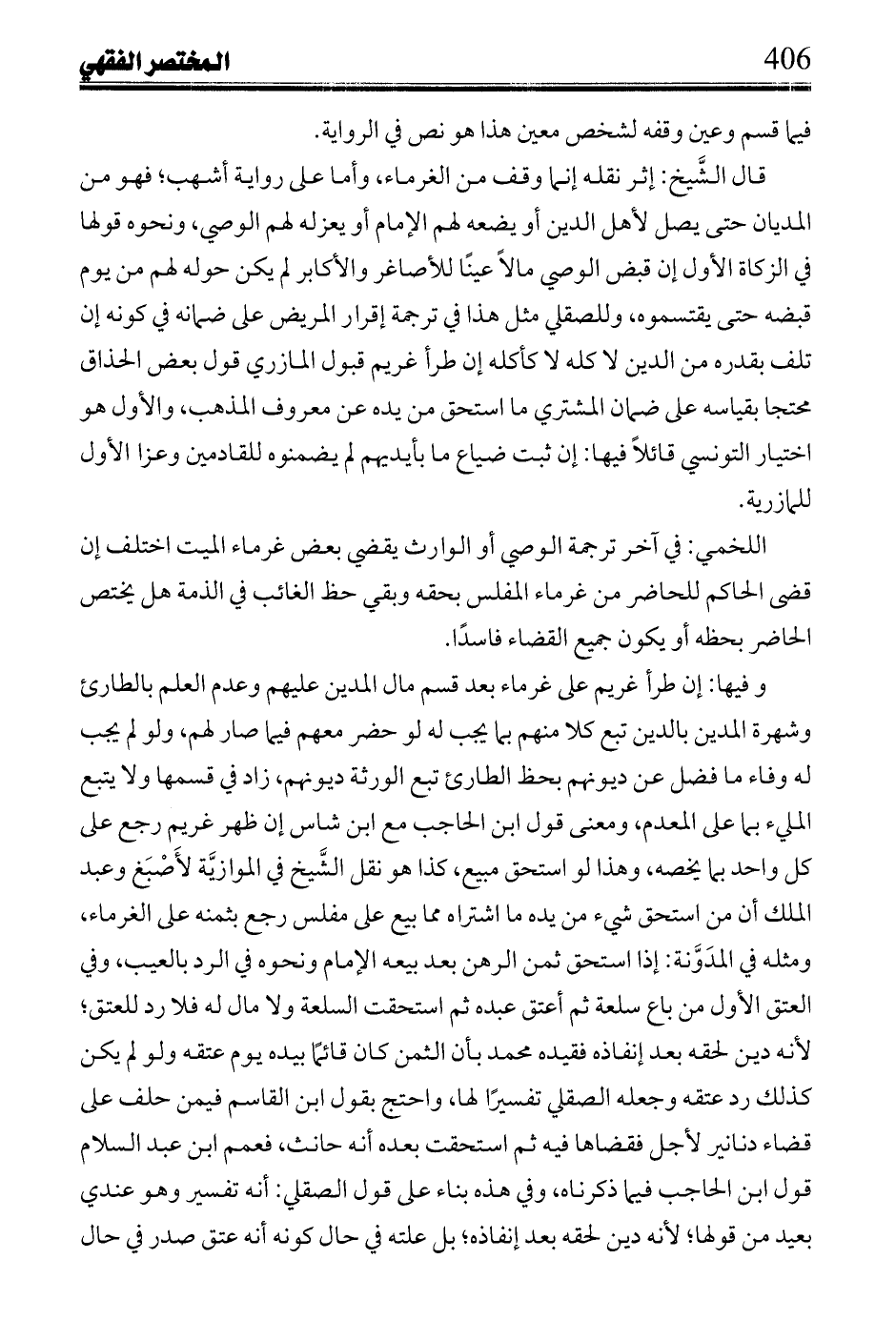 قال الشيخ: إثر نقله إنما وقف من الغرماء، وأما على رواية أشهب؛ فهو من المديان حتى يصل لأهل الدين أو يضعه لهم الإمام أو يعزله لهم الوصي، ونحوه قولها في الزكاة الأول إن قبض الوصي مالا عينا للأصاغر والأكابر لم يكن حوله لهم من يوم قبضه حتى يقتسموه، وللصقلي مثل هذا في ترجمة إقرار المريض على ضمانه في كونه إن تلف بقدره من الدين لا كله لا كأكله إن طرأ غريم قبول المازري قول بعض الحذاق محتجا بقياسه على ضمان المشتري ما استحق من يده عن معروف المذهب، والأول هو اختيار التونسي قائلا فيها: إن ثبت ضياع ما بأيديهم لم يضمنوه للقادمين وعزا الأول للمازرية.