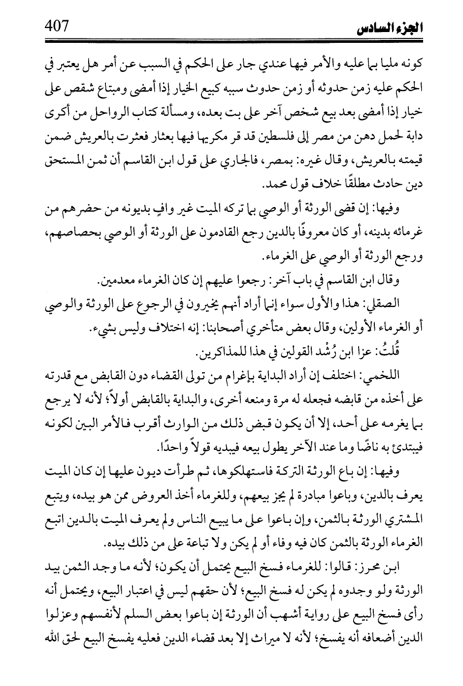 ابن محرز: قالوا: للغرماء فسخ البيع يحتمل أن يكون؛ لأنه ما وجد الثمن بيد الورثة ولو وجدوه لم يكن له فسخ البيع؛ لأن حقهم ليس في اعتبار البيع، ويحتمل أنه رأي فسخ البيع على رواية أشهب أن الورثة إن باعوا بعض السلم لأنفسهم وعزلوا الدين أضعافه أنه فسخ؛ لأنه لا ميراث إلا بعد قضاء الدين فعليه يفسخ البيع لحق الله