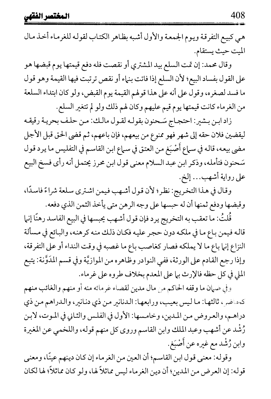 زاد ابن بشير: احتجاج سحنون بقوله لقول مالك: من حلف بحرية رقيقه ليقضين فلان حقه إلى شهر فهو ممنوع من بيعهم، فإن باعهم، ثم قضى الحق قبل الأجل مضى بيعه، قاله في سماع أصبغ من العتق في سماع ابن القاسم في التفليس ما يرد قول سحنون فتأمله، وذكر ابن عبد السلام معنى قول ابن محرز أنه رأى فسخ البيع على رواية أشهب ... إلخ.