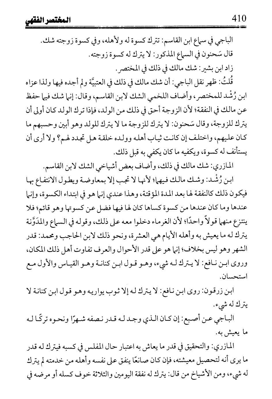 قلت: ظهر نقل الباجي: أن شك مالك في ذلك في «العتبية» ولم أجده فيها ولذا عزاه ابن رشد للمختصر، وأضاف اللخمي الشك لابن القاسم، وقال: إنما شك فيما حفظ عن مالك في النفقة؛ لأن الزوجة أحق في ذلك من الولد، فإذا ترك الولد كان أولى أن يترك للزوجة، وقال سَحنون: لا يترك للزوجة ما لا يترك للولد وهو أبين وحسبهم ما كان عليهم، واختلف إن كانت ثياب أهله وولده خلقة هل تجدد لهم؟ ولا أرى أن يستأنف له كسوة، ويكفيه ما كان يكفي به قبل ذلك.
