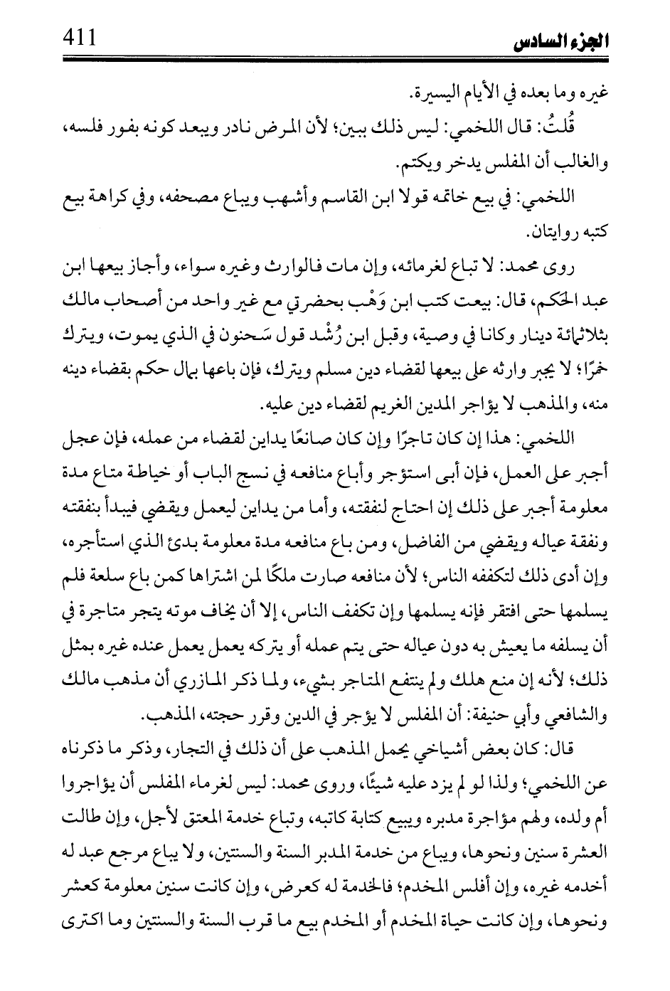 قال: كان بعض أشياخي يحمل المذهب على أن ذلك في التجار، وذكر ما ذكرناه عن اللخمي؛ ولذا لو لم يزد عليه شيئا، وروى محمد: ليس لغرماء المفلس أن يؤاجروا أم ولده، ولهم مؤاجرة مدبره ويبيع كتابة كتابه، وتباع خدمة المعتق لأجل، وإن طالت العشرة سنين ونحوها، ويباع من خدمة المدبر السنة والسنتين، ولا يباع مرجع عبد له أخدمه غيره، وإن أفلس المخدم؛ فالخدمة له كعرض، وإن كانت سنين معلومة كعشر ونحوها، وإن كانت حياة المخدم أو المخدم بيع ما قرب السنة والسنتين وما اكترى