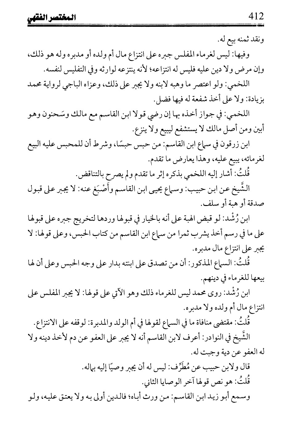 ابن رشد: روى محمد ليس للغرماء ذلك وهو الآتي على قولها: لا يجبر المفلس على انتزاع مال أم ولده ولا مدبره.