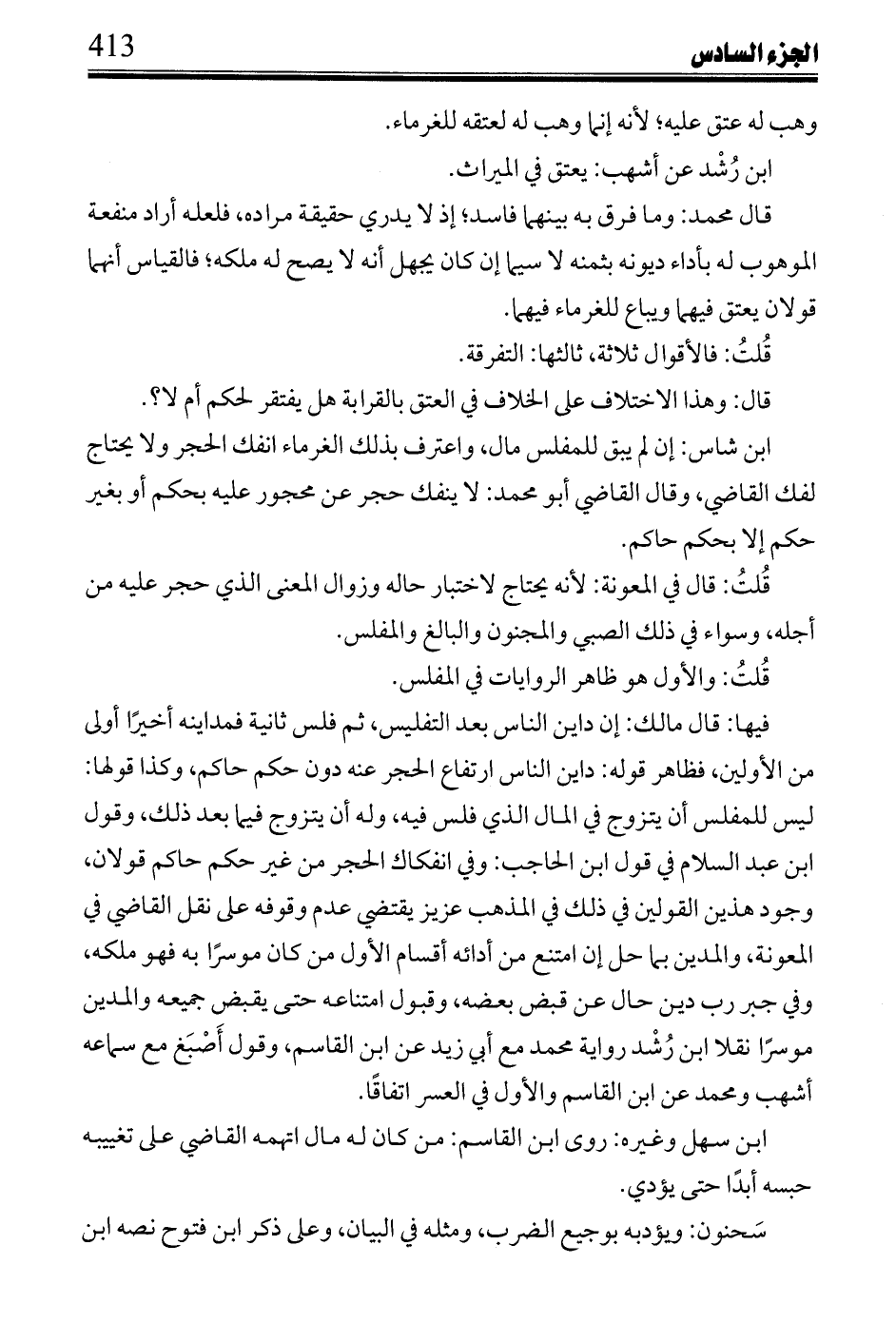 ابن شاس: إن لم يبق للمفلس مال، واعترف بذلك الغرماء انفك الحجر ولا يحتاج لفك القاضي، وقال القاضي أبو محمد: لا ينفك حجر عن محجور عليه بحكم أو بغير حكم إلا بحكم حاكم.