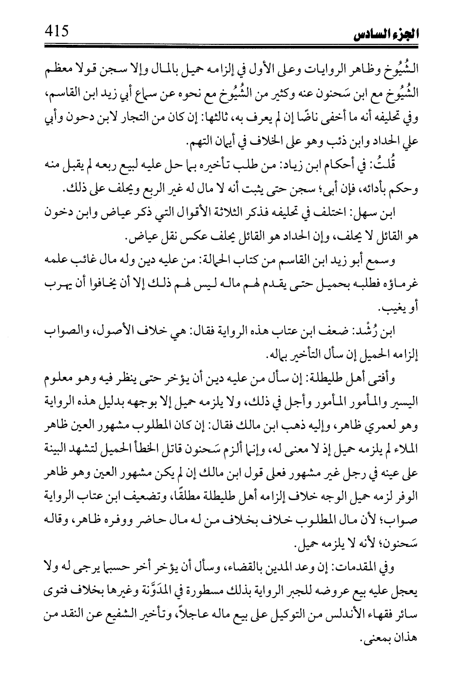 ابن رشد: ضعف ابن عتاب هذه الرواية فقال: هي خلاف الأصول، والصواب إلزامه الحميل إن سأل التأخير بماله.