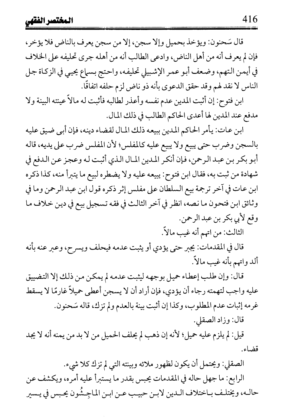 ابن عات: يأمر الحاكم المدين ببيعه ذلك المال لقضاء دينه، فإن أبى ضيق عليه بالسجن وضرب حتى يبيع ولا يبيع عليه كالمفلس؛ لأن المفلس ضرب على يديه، قاله أبو بكر بن عبد الرحمن، فإن أنكر المدين المال الذي أثبت له وعجز عن الدفع في شهادة من ثبت به، فقال ابن فتوح: يبيعه عليه ولا يضطره لبيع ما يتبرأ منه، كذا ذكره ابن عات في آخر ترجمة بيع السلطان على مفلس إثر ذكره قول ابن عبد الرحمن وما في وثائق ابن فتحون ما نصه، انظر في آخر الثالث في فقه تسجيل بيع في دين خلاف ما وقع لأبي بكر بن عبد الرحمن.