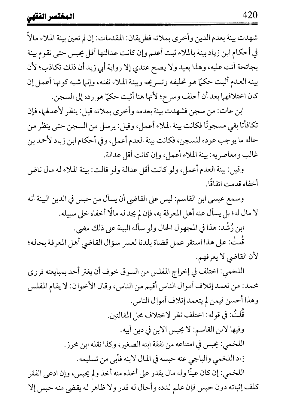 ابن عات: من سجن فشهدت بينة الملاء أعمل، وقيل: يرسل من السجن حتى ينظر من حاله ما يوجب عوده للسجن، فكانت بينة العدم أعمل، وفي أحكام ابن زياد لأحمد بن غالب ومعاصريه: بينة الملاء أعمل، وإن كانت أقل عدالة.