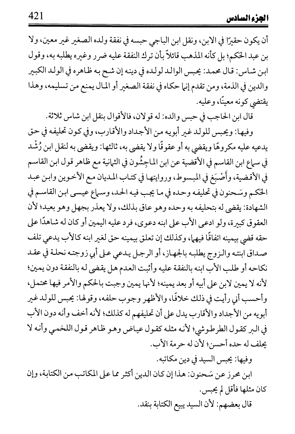 أن يكون حقيرا في الابن، ونقل ابن الباجي حبسه في نفقة ولده الصغير غير معين، ولا بن عبد الحكم؛ بل كأنه المذهب قائلا بأن ترك النفقة عليه ضرر وغيره يطلبه به، وقول ابن شاس: قال محمد: يحبس الوالد لولده في دينه إن شح به ظاهره في الولد الكبير والدين في الذمة، ومن تقدم إنما حكماه في نفقة الصغير أو المال يمنع من تسليمه، وهذا يقتضي كونه معينا، وعليه.