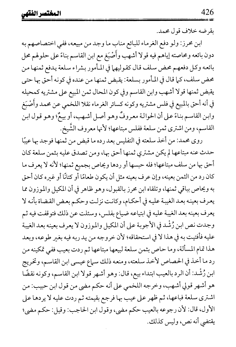 روى محمد: من أخذ سلعته في التفليس بعد رده ما قبض من ثمنها فوجد بها عيباً حدث عنه مبتاعها لم يكن مشتري ثمنها أحق بها، ومن تصدق عليه بثمن سلعة كان أحق بها من سلف مبتاعها؛ فله حبسها أو ردها ويحاص بجميع ثمنها؛ لأنه لا يعرف ما كان رد من الثمن بعينه، وإن عرف بعينه مثل أن يكون طعاماً أو كتاناً أو غيره كان أحق به ويحاص بباقي ثمنها، وتلقاه ابن محرز بالقبول، وهو ظاهر في أن المكيل والموزون مما يعرف بعينه بعد الغيبة عليه في أحكام، وكانت نزلت وحكم بعض القضاة بأنه لا يعرف بعينه بعد الغيبة عليه في ابتياعه ضياع بفلس، وسئلت عن ذلك فتوقفت فيه ثم وجدت نص ابن رُشْد في الأجوبة على أن المكيل والموزون لا يعرف بعينه بعد الغيبة عليه فأفتيت به في هذا لا في استحقاقه؛ لأن خروجه من يد ربه فيه بغير طوعه، وبعد هذا تمام المسألة، وما حاص بثمن سلعة لبيعها مبتاعها ثم ردت بعيب ففي تمكينه من رد ما أخذ في الحصاص لأخذ سلعته، ومنعه ذلك سماع عيسى ابن القاسم، وتخريج ابن رُشْد: أن الرد بالعيب ابتداء بيع، قال: وهو أشهر قولا ابن القاسم، وكونه نقضاً هو أشهر قولي أشهب، وخرجه اللخمي على أنه حكم مضى من قول ابن حبيب: من اشترى سلعة فباعها، ثم ظهر على عيب بها فرجع بقيمته ثم ردت عليه لا يردها على الأول، قال: لأن رجوعه بالعيب حكم مضى، وقول ابن الحاجب: وقيل: حكم مضى؛ يقتضي أنه نص، وليس كذلك.