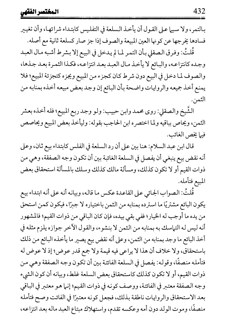 قال ابن عبد السلام: هنا بين على أن رد السلعة في الفلس كابتداء بيع ثان، وعلى أنه نقض بيع ينبغي أن يفصل في السلعة الغائبة بين أن تكون وجه الصفقة، وهي من ذوات القيم أو لا تكون كذلك، ومسألة مالك كذلك وسلك بالمسألة استحقاق بعض المبيع فتأمله.