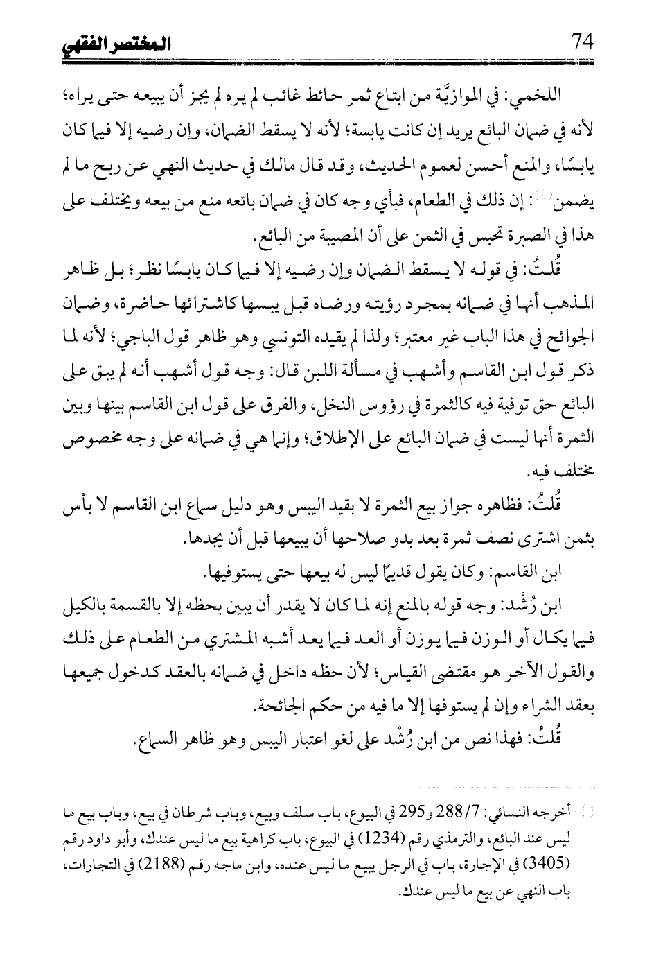 قُلتُ: في قوله لا يسقط الضمان وإن رضيه إلا فيما كان يابسًا نظر؛ بل ظاهر المذهب أنها في ضمانه بمجرد رؤيته ورضاه قبل يبسها كاشترائها حاضرة، وضمان الجوائح في هذا الباب غير معتبر؛ ولذا لم يقيده التونسي وهو ظاهر قول الباجي؛ لأنه لما ذكر قول ابن القاسم وأشهب في مسألة اللبن قال: وجه قول أشهب أنه لم يبق على البائع حق توفية فيه كالثمرة في رؤوس النخل، والفرق على قول ابن القاسم بينهما وبين الثمرة أنها ليست في ضمان البائع على الإطلاق؛ وإنما هي في ضمانه على وجه مخصوص مختلف فيه.