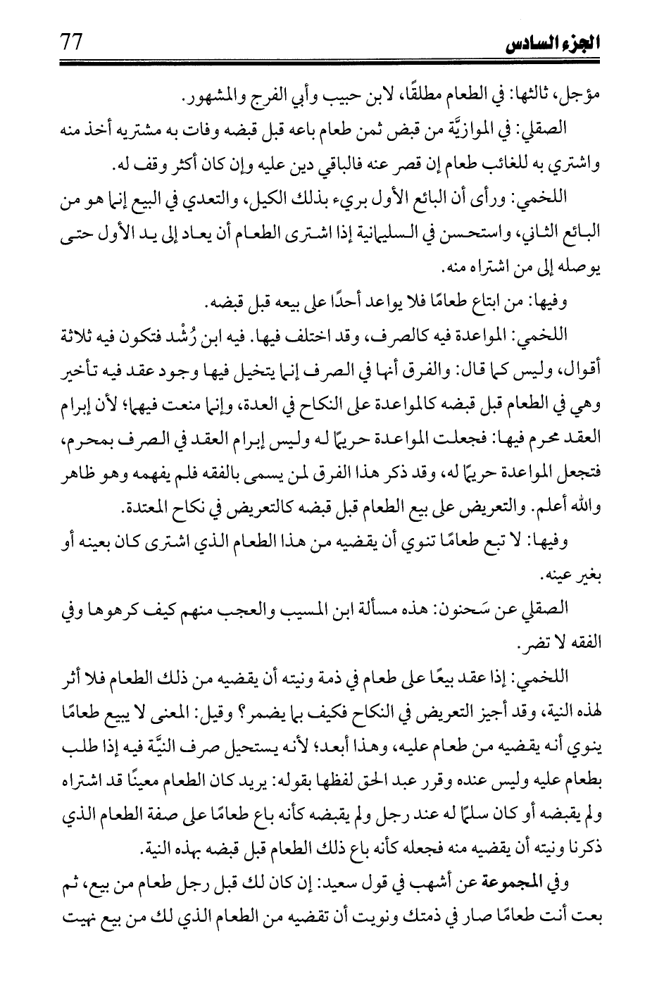 اللخمي: إذا عقد بيعًا على طعام في ذمة ونيته أن يقضيه من ذلك الطعام فلا أثر لهذه النية، وقد أجيز التعريض في النكاح فكيف بما يضمر؟ وقيل: المعنى لا يبيع طعامًا ينوي انه يقضيه من طعام عليه، وهذا أبعد؛ لأنه يستحيل صرف النيَّة فيه إذا طلب بطعام عليه وليس عنده وقرر عبد الحق لفظها ببقوله: يريد كان الطعام معينًا قد اشتراه ولم يقبضه أو كان سلمًا له عند رجل ولم يقبضه كأنه باع طعامًا على صفة الطعام الذي ذكرنا ونيته أن يقضيه منه فجعله كأنه باع ذلك الطعام قبل قبضه بهذه النية.