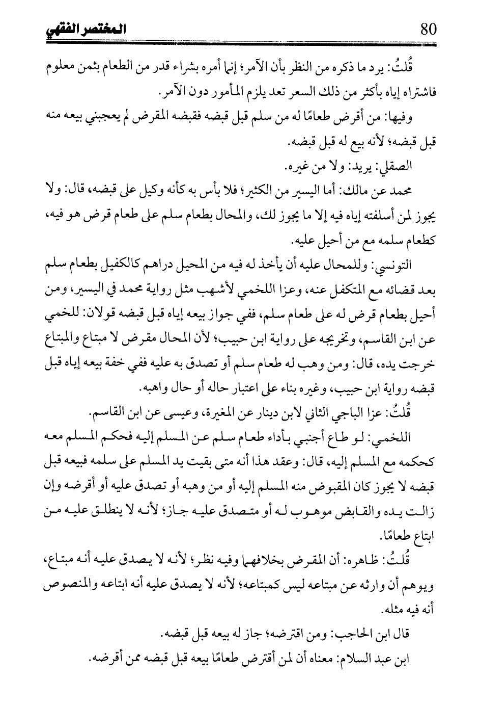 ابن عبد السلام: معناه أن لمن أقترض طعامًا بيعه قبل قبضه ممن أقرضه.