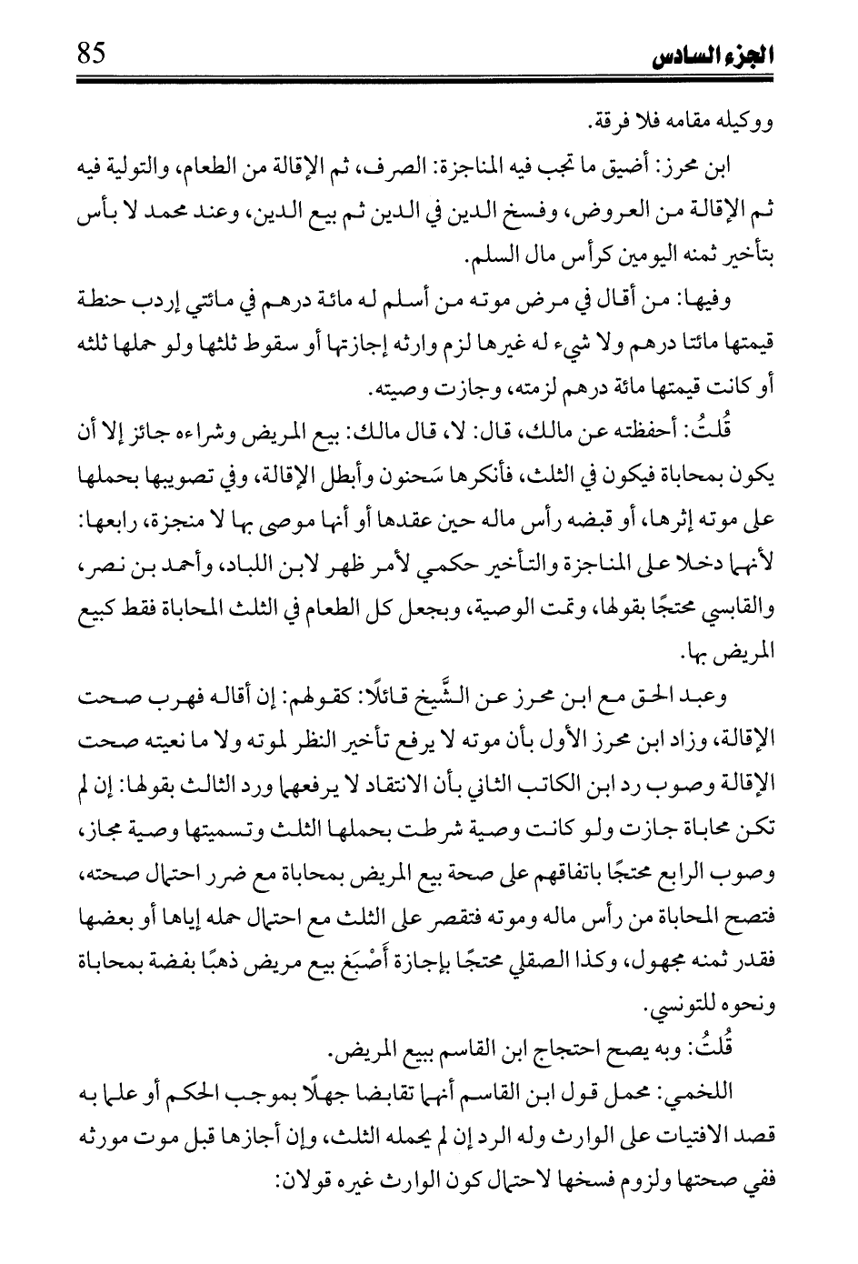 قُلتُ: أحفظته عن مالك، قال: لا، قال مالك: بيع المريض وشراءه جائز إلا أن يكون بمحاباة فيكون في الثلث، فأنكرها سَحنون وأبطل الإقالة، وفي تصويبها بحملها على موته إثرها، أو قبضه رأس ماله حيث عقدها أو أنها موصى بها لا منجزة، رابعها: لأنهما دخلا على المناجزة والتأخير حكمي لأمر ظهر لابن اللباد، وأحمد بن نصر، والقابسي محتجًا بقولها، وتمت الوصية، ويجعل كل الطعام في الثلث المحاباة فقط كبيع المريض بها.