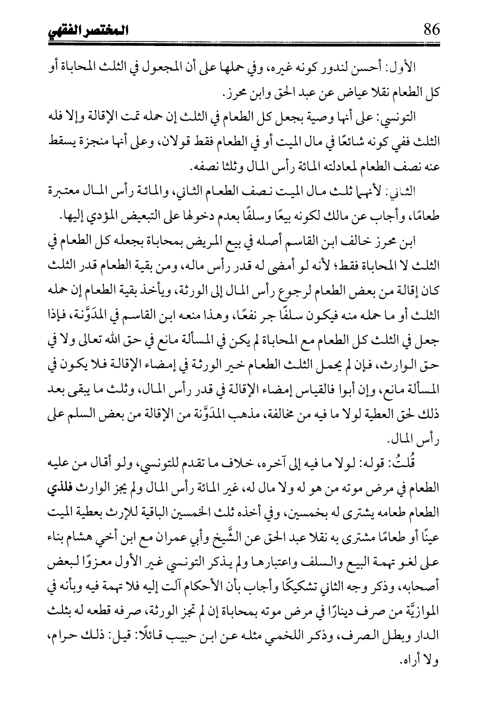التونسي: على أنها وصية بجعل كل الطعام في الثلث إن حمله تمت الإقالة وإلا فله الثلث ففي كونه شائعاً في مال الميت أو في الطعام فقط قولان، وعلى أنها منجزة يسقط عنه نصف الطعام لمعادلته المائة رأس المال وثلثا نصفه.
